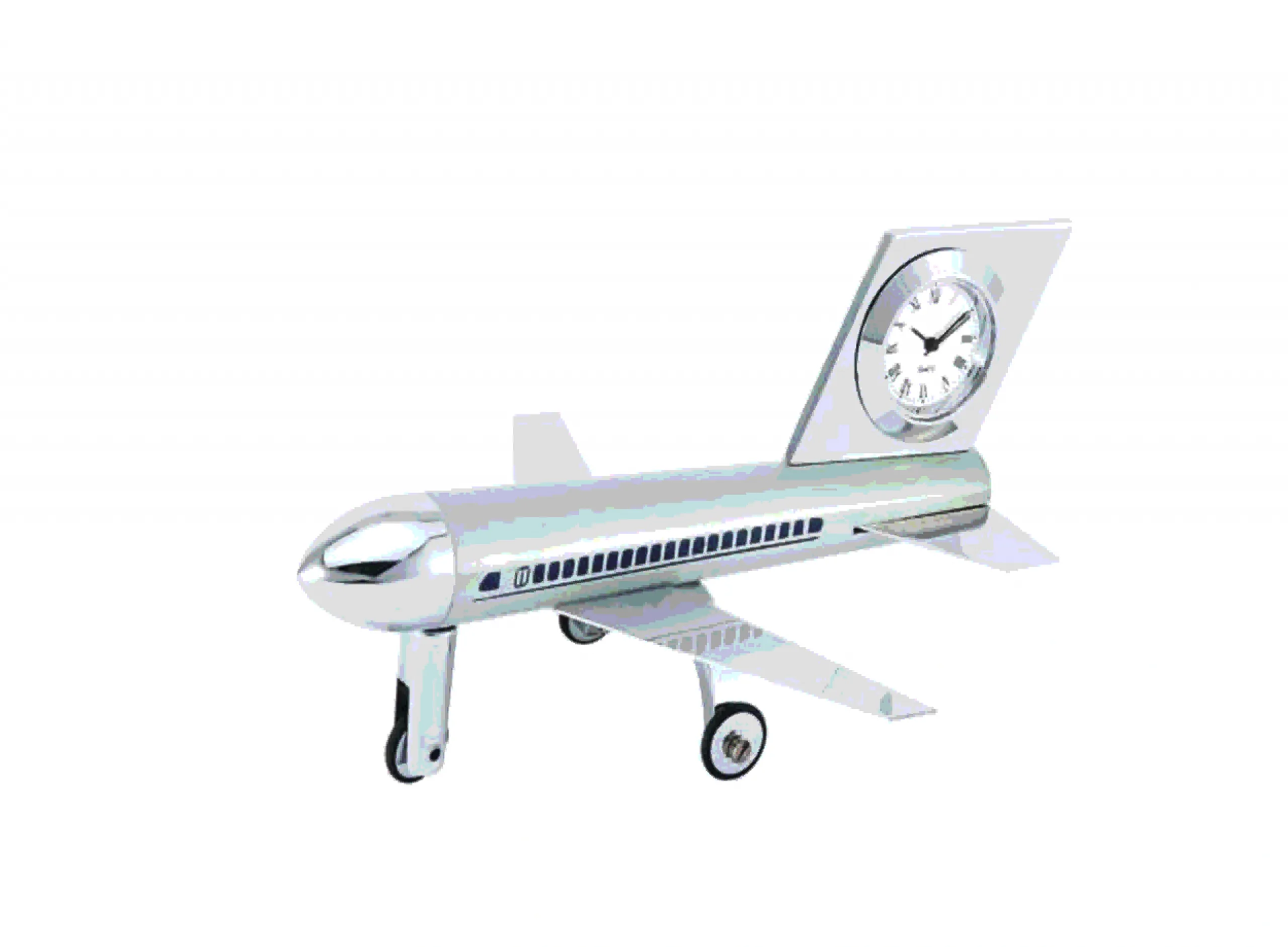 This polished silver airplane desk clock blends collectible model styling with practical timekeeping for a charming desktop accent. The streamlined fuselage houses a small, easy-read analog clock set into the vertical tail, while rolling landing-gear wheels and metal wings create a convincing miniature aircraft silhouette. Lightweight but sturdy, the model sits steadily on a flat surface and suits desks, shelves, reception counters and mantels. Its metallic finish complements wood, glass and modern office interiors, adding a touch of travel nostalgia and mechanical elegance. Ideal for aviation enthusiasts, frequent flyers, flight crew and corporate gifting, the piece functions equally well as a novelty ornament or a functional timepiece.