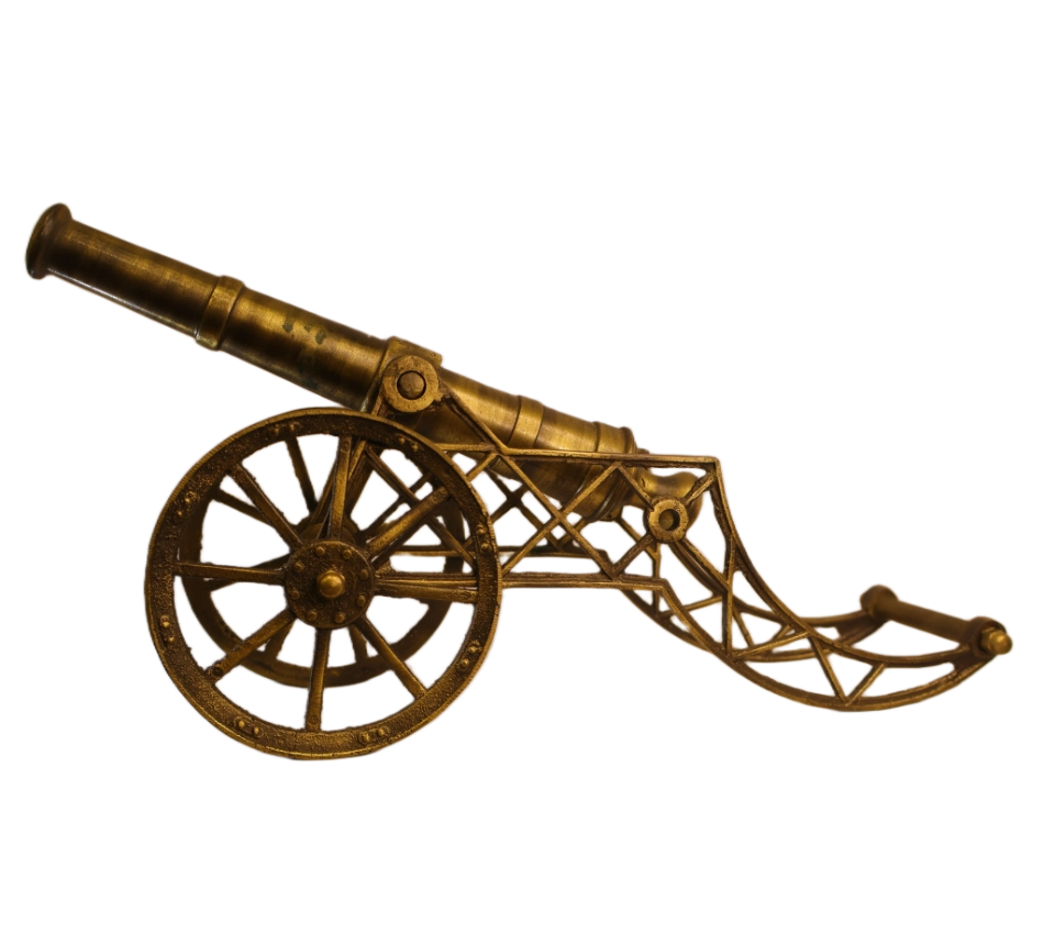 This antique-style miniature brass cannon is a compact, museum-inspired decorative replica designed to add vintage character to desks, shelves, and mantel displays. Meticulously crafted, the piece features a tapered brass barrel mounted on an open-lattice carriage with a decorative spoked wheel and detailed fixing hardware. The warm, aged brass finish and visible craft details — from the barrel bands to carriage framework — evoke authentic naval and artillery models while remaining lightweight and easy to position. Its compact tabletop scale makes it versatile: use it as an executive desk ornament, bookshelf focal point, nautical or military-themed display, or a standout corporate gift. The model’s durable metal construction ensures longevity and an attractive patina over time. Whether displayed alone for minimalist impact or paired with framed maps and leather-bound books, this brass cannon brings texture, history, and a subtle sense of prestige to interiors.