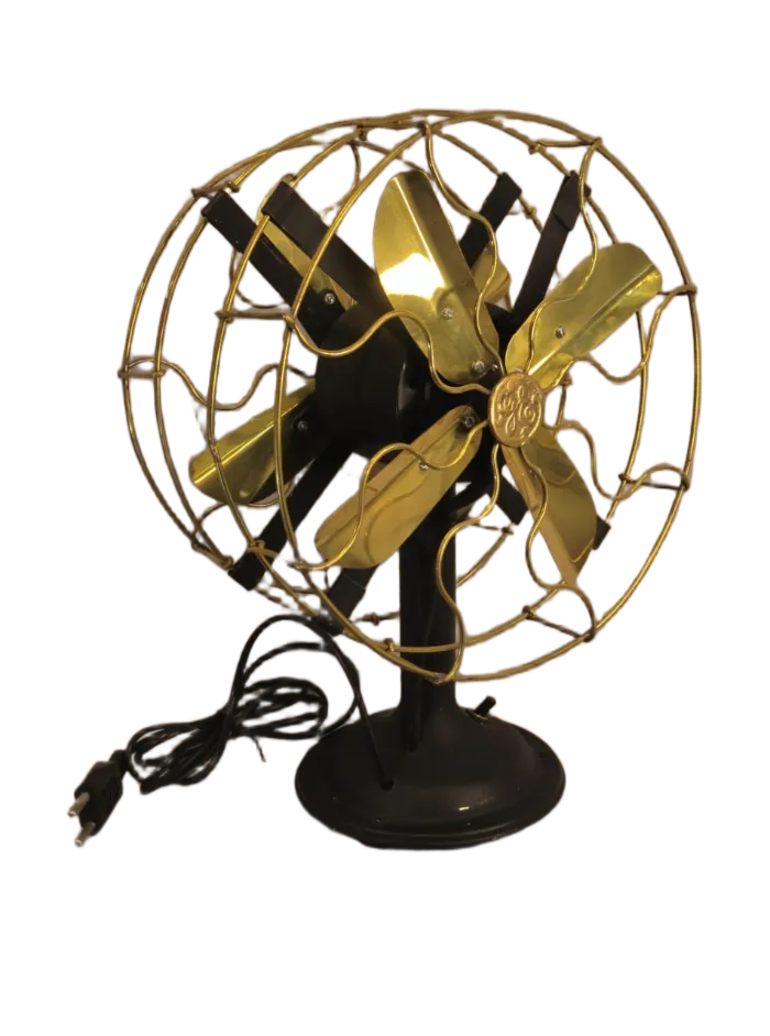 This striking antique brass desk fan pairs authentic vintage character with decorative presence. Polished brass blades and an intricately formed brass cage create warm metallic highlights, while a solid black pedestal base gives the piece stability and visual contrast — a design that reads equally well in a study, mantel display, or boutique interior. The fan is a plug-in electric model (cord and two-pin plug visible) and was built as a compact tabletop unit; whether used as a working conversation piece or as a purely decorative collector’s item, it instantly conveys old-world craftsmanship. The brass components show natural patina and minor surface wear consistent with age, which enhances the fan’s authentic vintage appeal; the base remains sturdy and the guard retains its ornate wirework. This fan suits collectors of early 20th-century appliances, interior decorators focusing on retro/industrial motifs, and anyone who wants a memorable desk accent that anchors a room in vintage style.
