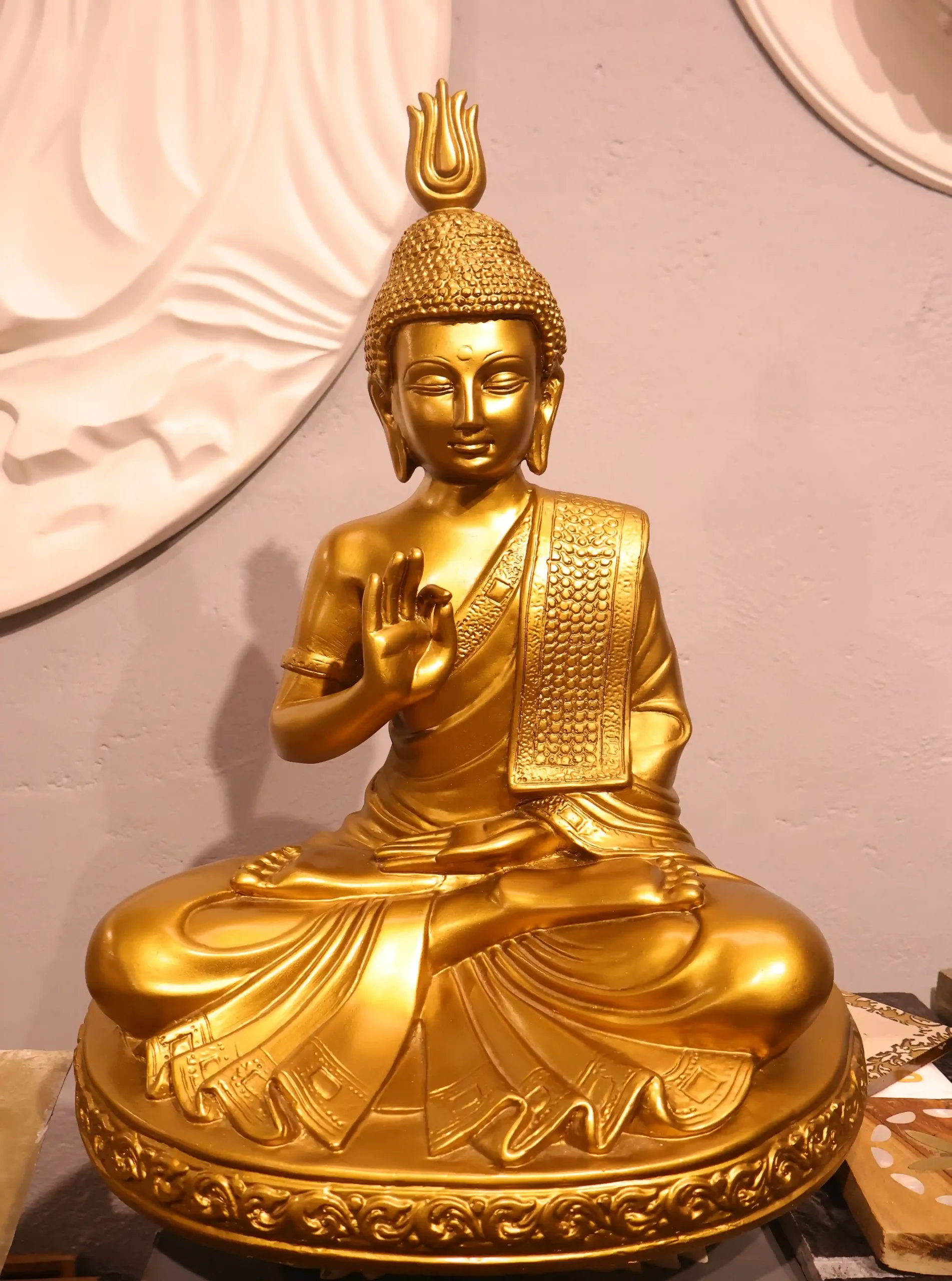 This golden Buddha statue captures a tranquil moment of meditation: the figure sits in the dhyana pose with calm expression, detailed drapery and an ornamental lotus base. A standout feature is the 999-hair detail on the ushnisha area, symbolically resonant for collectors and devotees; the fine curls are hand-finished to provide tactile depth and visual richness under warm light. The statue’s golden finish harmonizes with wood, brass and natural textiles, making it equally suited to a traditional home altar or a modern wellness studio.Ideal as a meaningful housewarming or graduation gift, a studio focal for yoga and meditation spaces, or a curated accent for mindful interiors.