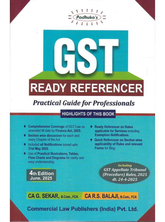 The GST Ready Referencer – Practical Guide for Professionals (4th Edition, 2025) is a comprehensive yet easy-to-use handbook designed to assist professionals in understanding and applying the provisions of the Goods and Services Tax (GST) law in India. GST legislation is constantly evolving with frequent amendments, notifications, and procedural updates, making it essential for professionals to have access to a clear and reliable reference source. This book aims to bridge that gap by presenting GST provisions in a structured and practical format. The book focuses on simplifying complex GST concepts and providing readers with quick access to essential information required for day-to-day professional practice. It offers clear explanations, practical insights, and structured references that help professionals interpret GST provisions and comply with legal requirements efficiently. The 4th Edition (2025) incorporates the latest developments in GST law, including recent amendments, clarifications, and compliance updates. The content is designed to address practical issues faced by professionals while dealing with GST returns, tax liability, procedural compliance, and regulatory interpretation. Unlike purely academic texts, the GST Ready Referencer emphasizes practical applicability and ease of understanding, making it a valuable tool for professionals who need quick guidance in their daily work. The clear organization and accessible presentation ensure that readers can easily locate relevant provisions and understand their practical implications. Overall, the book serves as a reliable and practical GST reference for anyone involved in taxation, compliance, or business operations under India’s GST regime.
