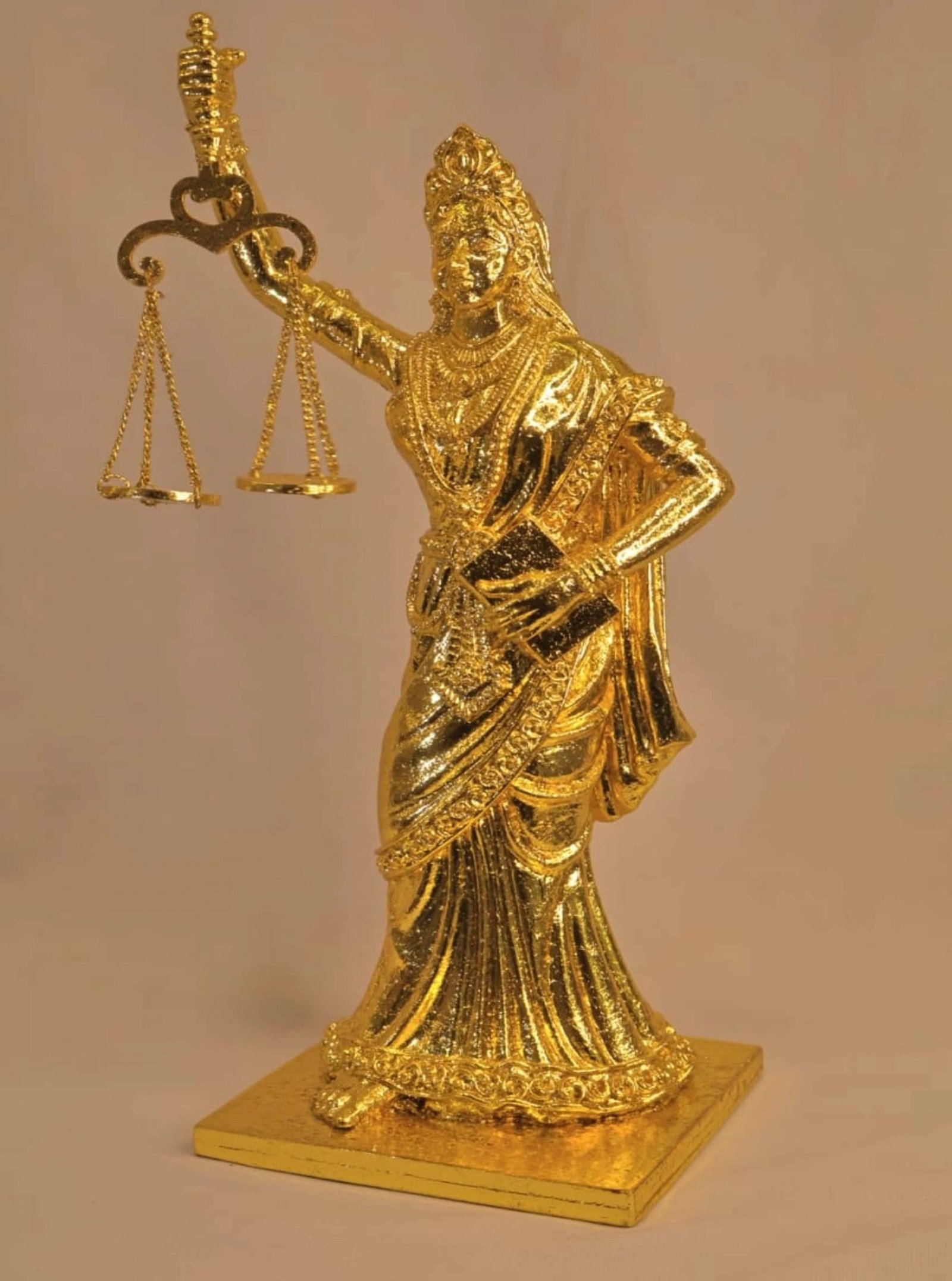 This gold-gilded Lady Justice statue combines classical legal symbolism with decorative finish to create a striking emblem of fairness and authority. The figure holds the balanced scales aloft and a book at her side, while the blindfold motif reinforces impartiality; finely worked drapery and torso details catch light across the gilded surface for a premium visual effect. Mounted on a solid square base, the statuette is sized for tabletop and shelf display and ships well when packaged with protective padding. Commonly produced in metal or resin with a gilded coating, the piece offers museum-like presence without the weight or cost of solid metal.