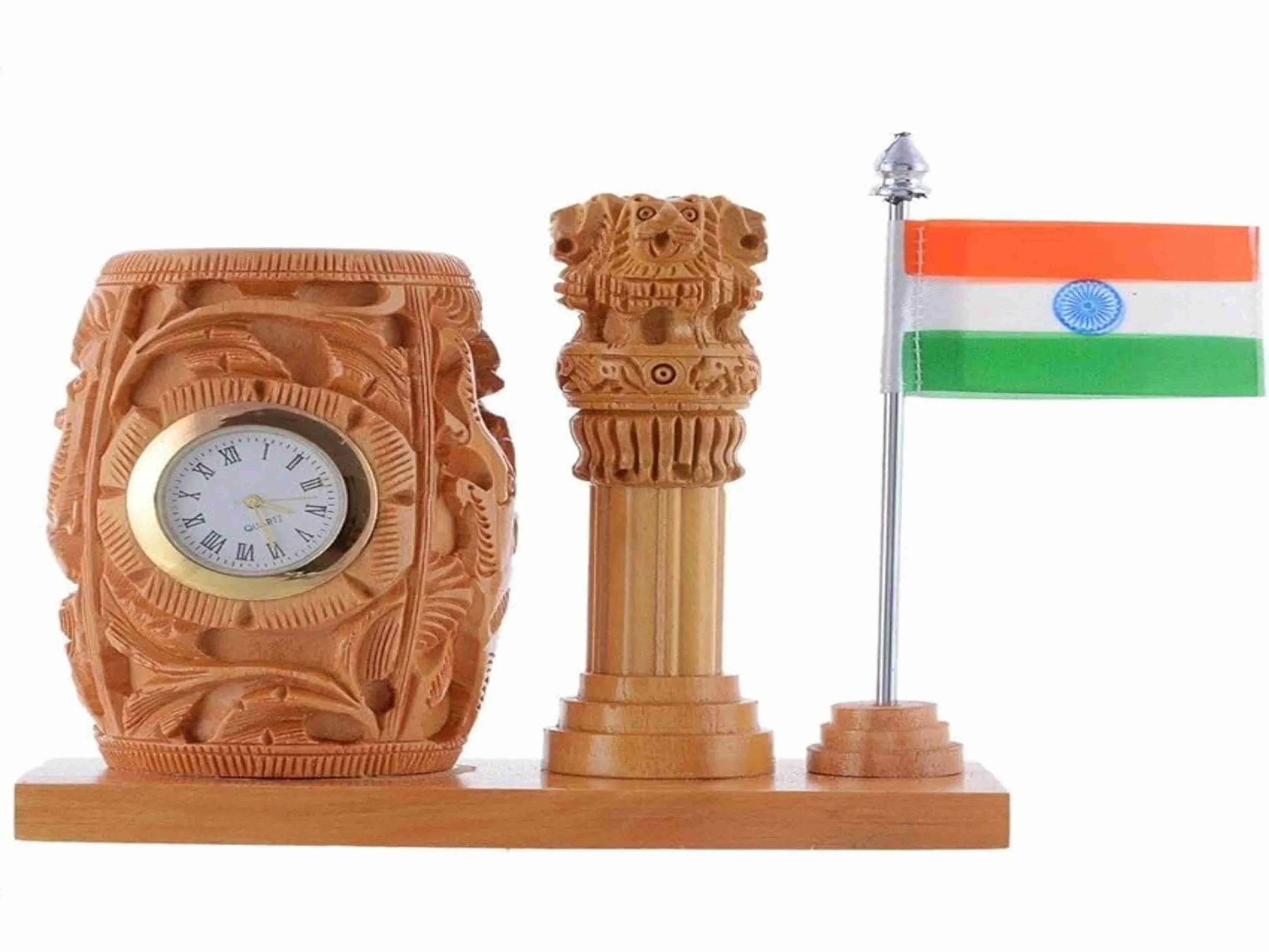 This dark-brown wooden desk showpiece blends traditional Indian symbolism with refined craftsmanship. Mounted on a solid rectangular base, the set includes a miniature tri-color flag on a metal staff, a detailed Ashoka Pillar replica (hand-carved look with layered pedestal), and an intricately carved wooden vase element — together creating a balanced, stately tabletop composition. The materials and finishing emphasize warm wood tones and polished dark-brown accents that suit executive desks, reception areas, and study tables. Lightweight yet stable, it’s an ideal corporate gift for law firms, government offices, and educational institutions or a memorable token for patriotic occasions like Republic Day and Independence Day. The showpiece functions as both decorative art and a conversation starter—perfect for showcasing national pride in a professional setting.