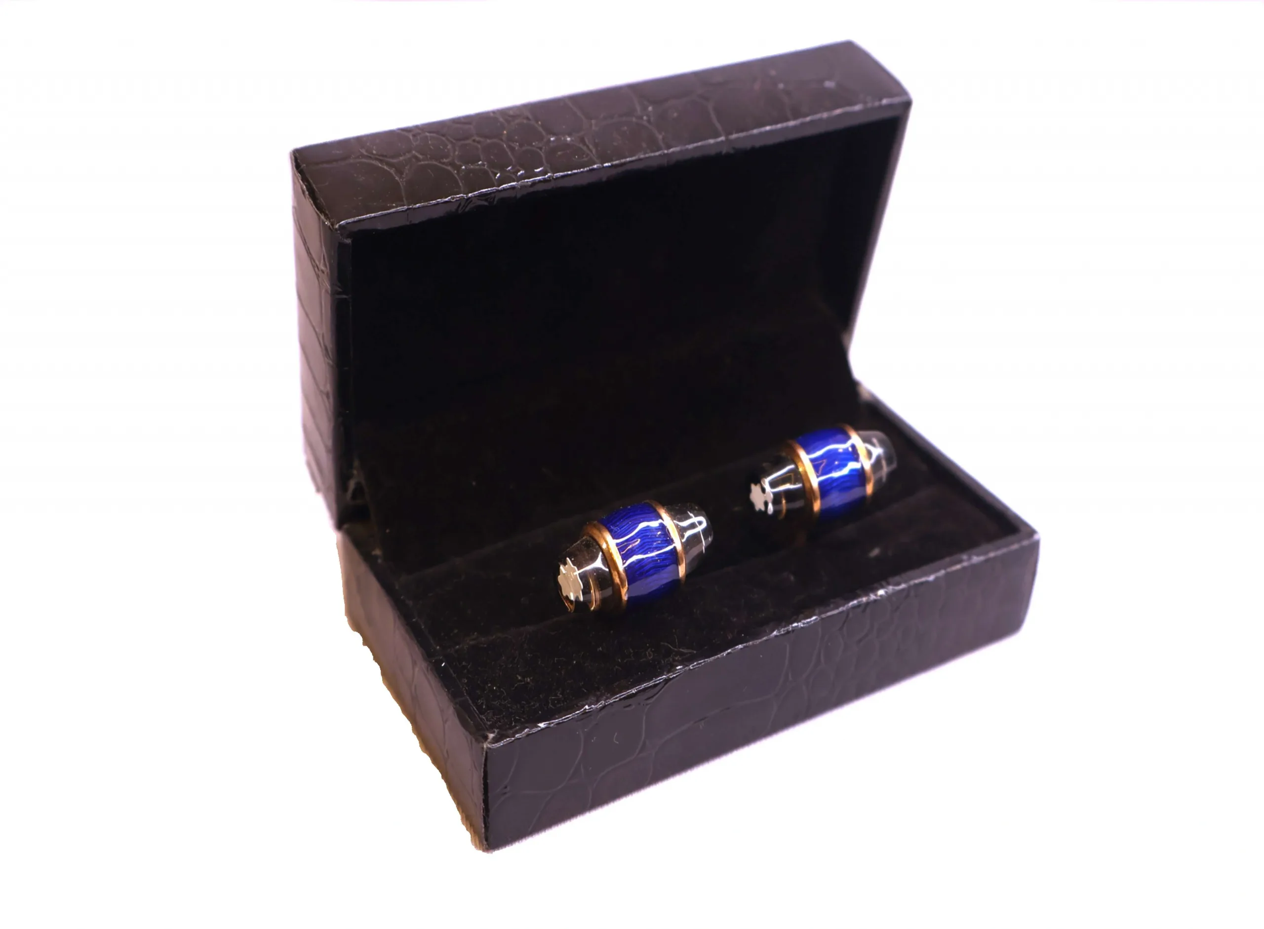 A distinguished pair of gold-tone cufflinks featuring a signature domed black gemstone or resin inset (reminiscent of the Mont Blanc star). The dome is housed within a substantial gold-tone setting, possibly featuring a subtle ribbed or engraved texture around the edge. A small clear crystal or cabochon sits at the center of the black dome, adding a final luxurious detail. The cufflinks are presented in a black, embossed leather-look hinged box with a black velvet-lined interior, perfect for a sophisticated look.