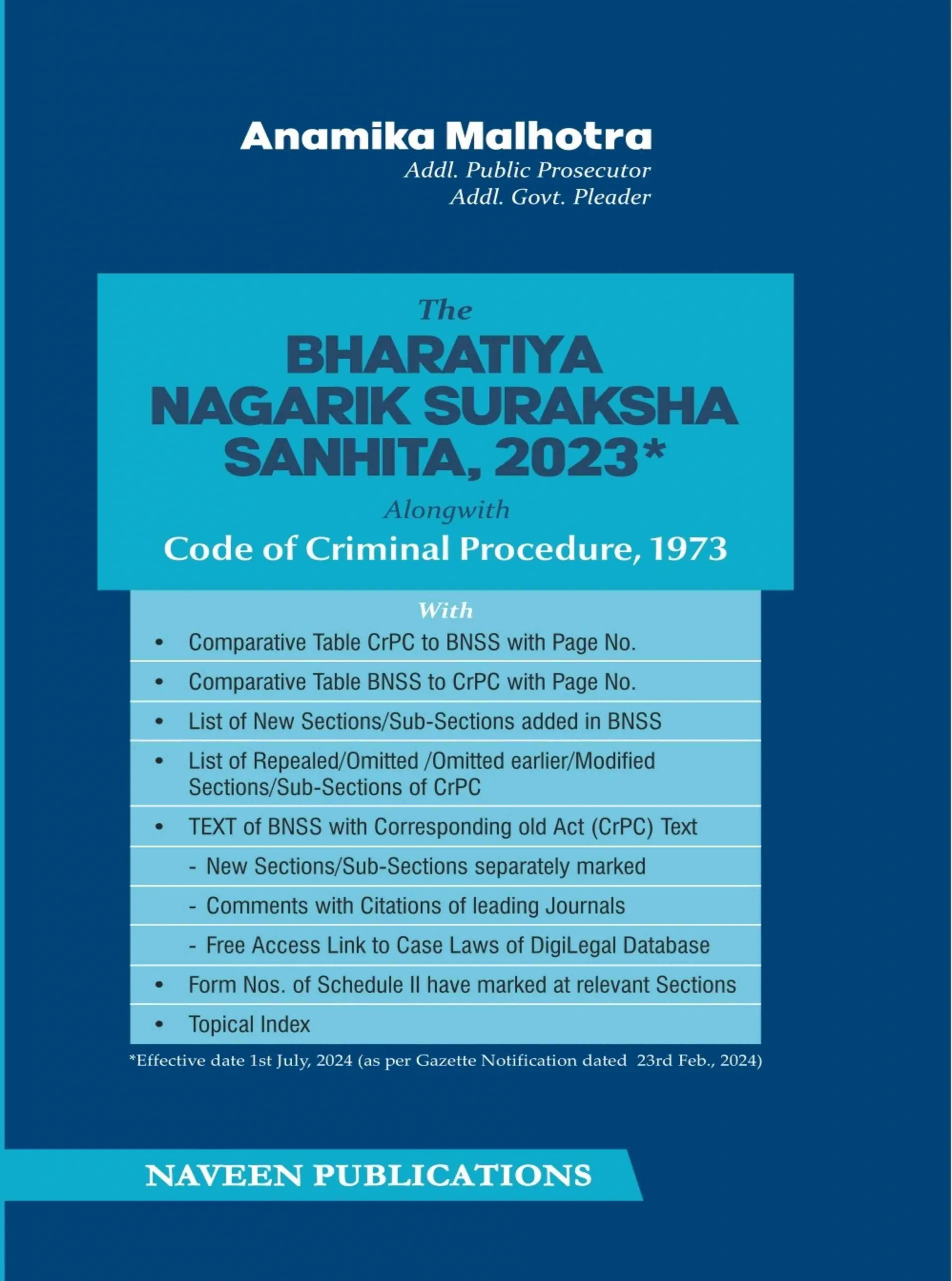 The Bharatiya Nagarik Suraksha Sanhita, 2023 along with the Code of Criminal Procedure, 1973 by Anamika Malhotra is a definitive legal reference tailored for the post-CrPC era of Indian criminal justice. Effective from 1st July 2024, BNSS introduces structural, procedural, and terminological changes that demand careful understanding and accurate application.