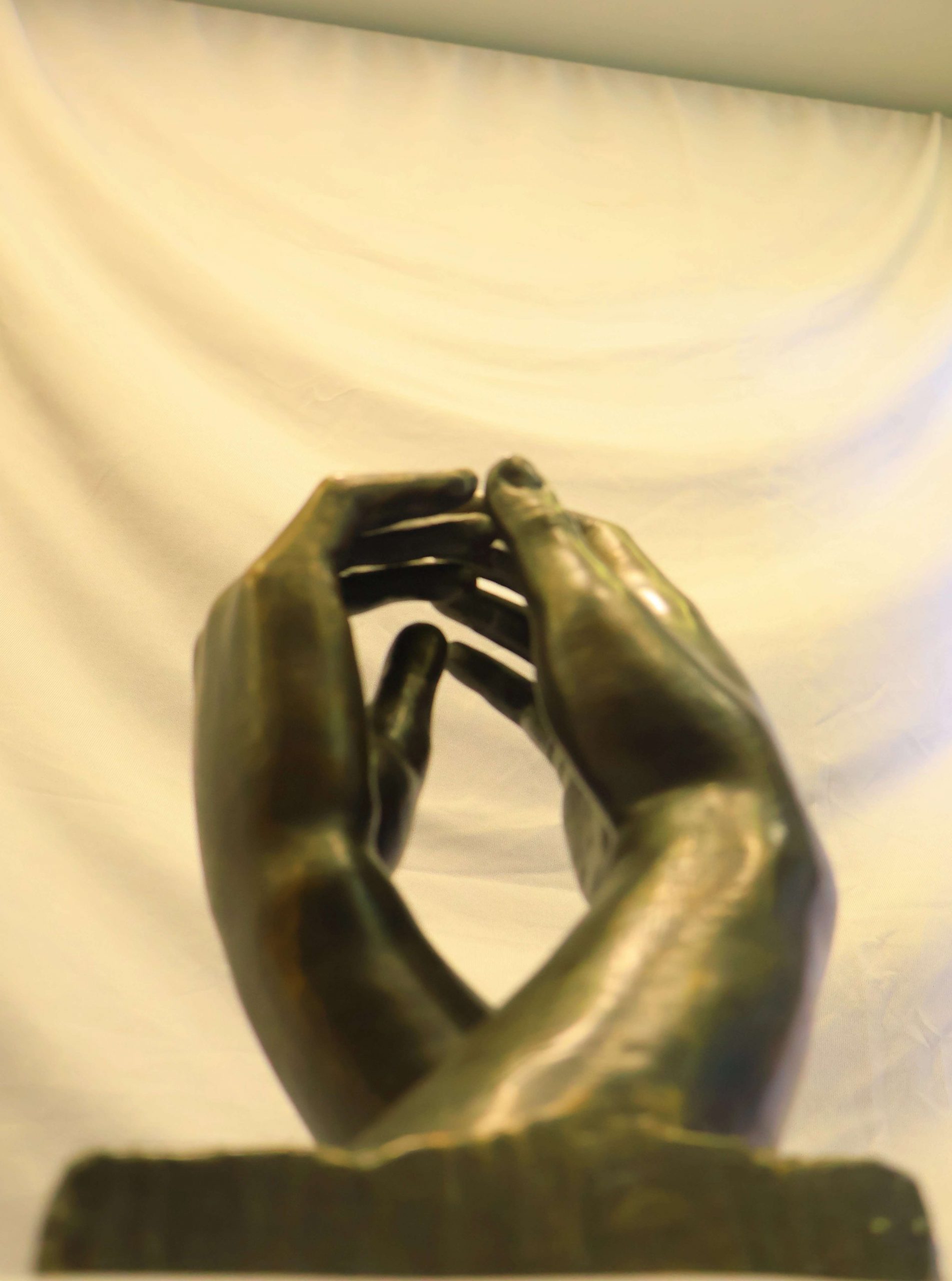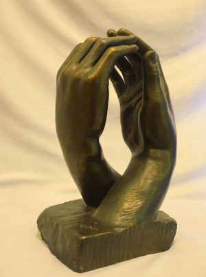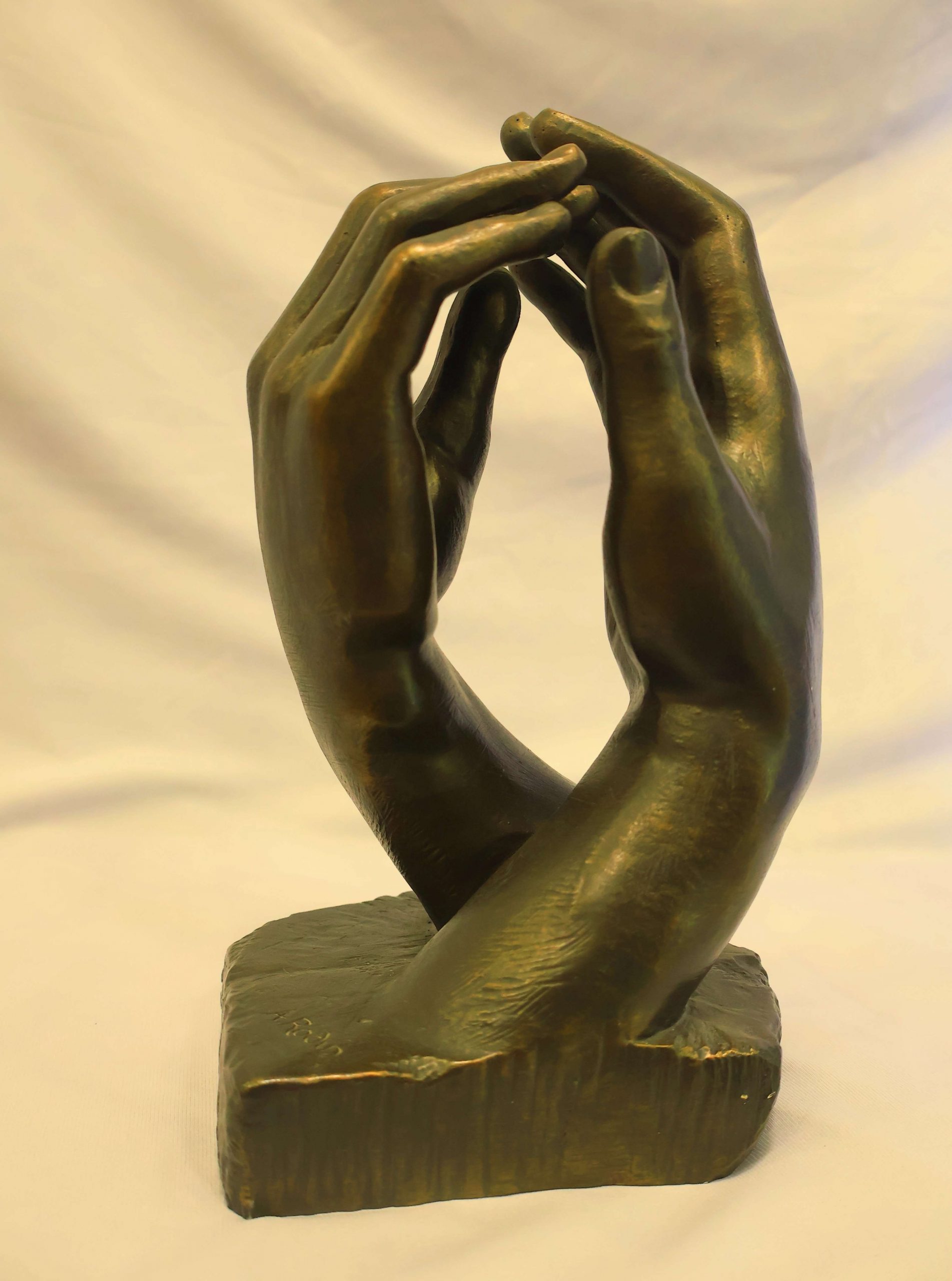 This lifelike bronze-finish hands sculpture captures a quiet moment of care and focus: two delicately modelled hands cupped together to create a soft circular void. Finished in a warm bronze patina with subtle highlights and a textured base, the piece reads both classical and modern—equally at home on a mantel, desk, altar, or hospitality reception. The anatomy is rendered with realistic attention to nails, knuckles and palm lines, inviting close viewing and gentle touch. Its scale is compact enough for smaller surfaces while offering a gallery-style presence; the weighted base gives stable display. Use it alone as a contemplative focal object or pair it with books, candles or small plants to build a curated vignette.