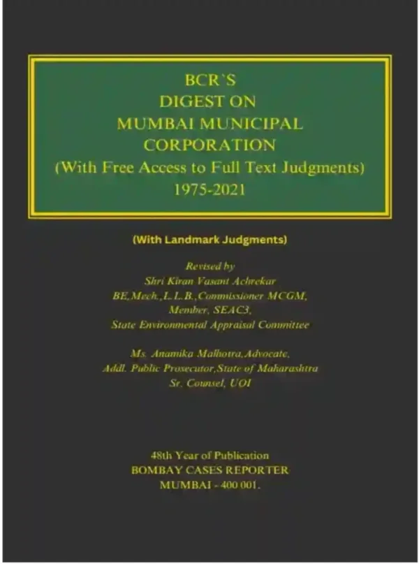 The BCR Digest on Mumbai Municipal Corporation (1975–2021) is a practitioner-oriented compendium that distils decades of municipal law into a single, highly usable volume. Covering landmark and routine rulings affecting municipal governance, taxation, licensing, land use, public health & sanitation, urban planning, environmental obligations and municipal contracts, the digest provides succinct headnotes that capture the ratio decidendi and practical implications for litigation and administration. Each entry includes precise citation format and a direct cross-reference to the reported full text; the digest is organized with a detailed topical index and table of cases for fast retrieval. Editorial observations (by the contributors/revisers named in the volume) highlight doctrinal trends, procedural pitfalls and drafting tips for municipal pleadings. Notably, the edition offers free-access pointers to full-text judgments—bridging the gap between a short headnote and the complete report—so users can quickly move from summary to source. Designed for everyday courtroom work, advisory practice, municipal counsel and scholarly use, this digest transforms a wide body of municipal jurisprudence (1975–2021) into an actionable research and citation tool that speeds brief preparation, bench research and academic study.