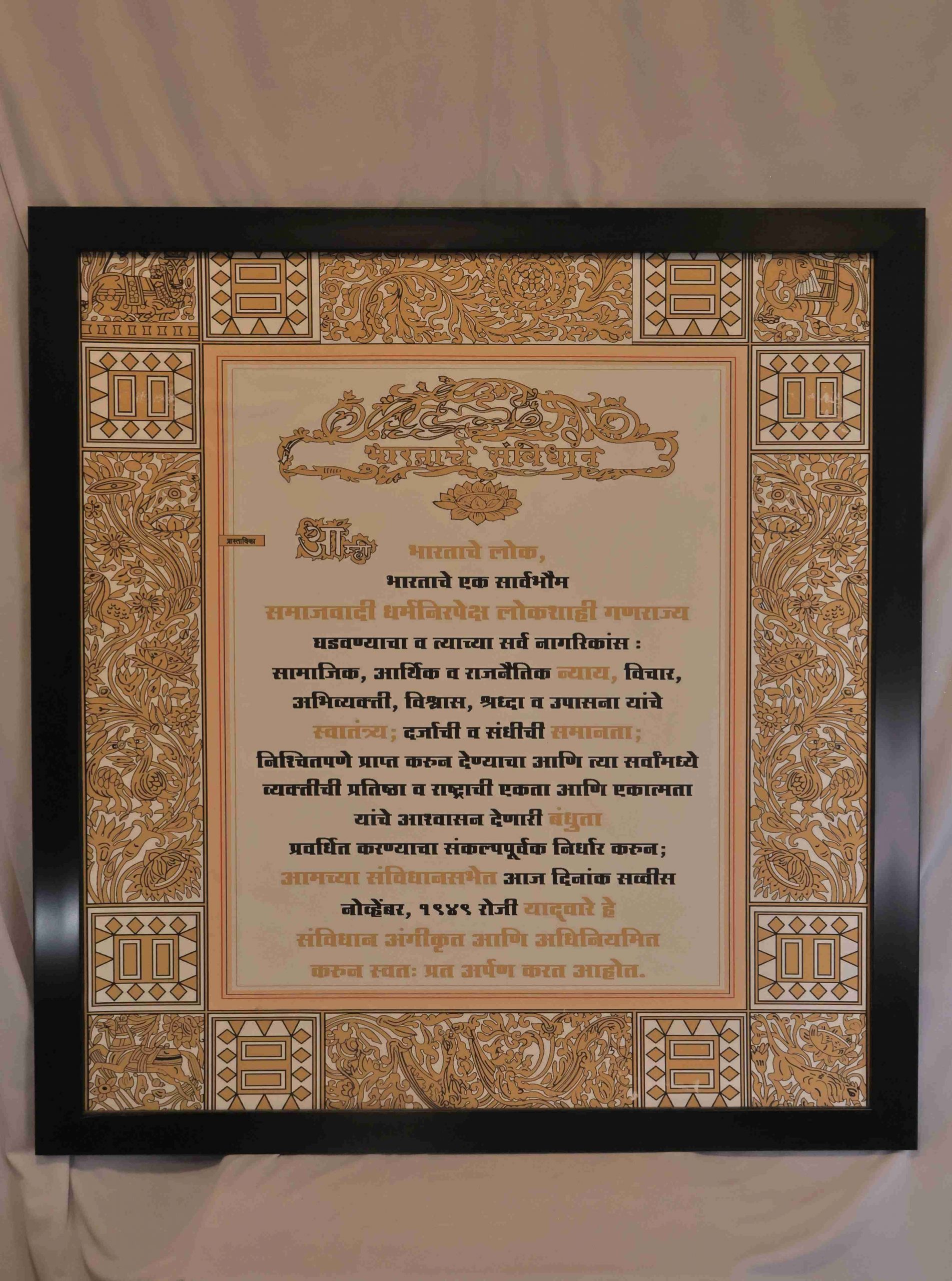 This museum-grade framed print reproduces the Preamble to the Constitution of India in Marathi (Bharatacha Samvidhan) with archival precision and an ornate, traditional border to honor the document’s historic importance. Printed on heavyweight acid-free paper using pigment inks, the piece is offered with museum matting and a choice of solid wood or elegant black framing for long-term display. The Marathi typography has been laid out for legibility at common viewing distances, making the print suitable for classrooms, law libraries, court receptions, municipal chambers and homes that value civic heritage. Beyond decorative use, the framed Preamble acts as an educational tool—reminding viewers of constitutional principles (justice, liberty, equality, fraternity) and encouraging civic literacy in Marathi-speaking communities