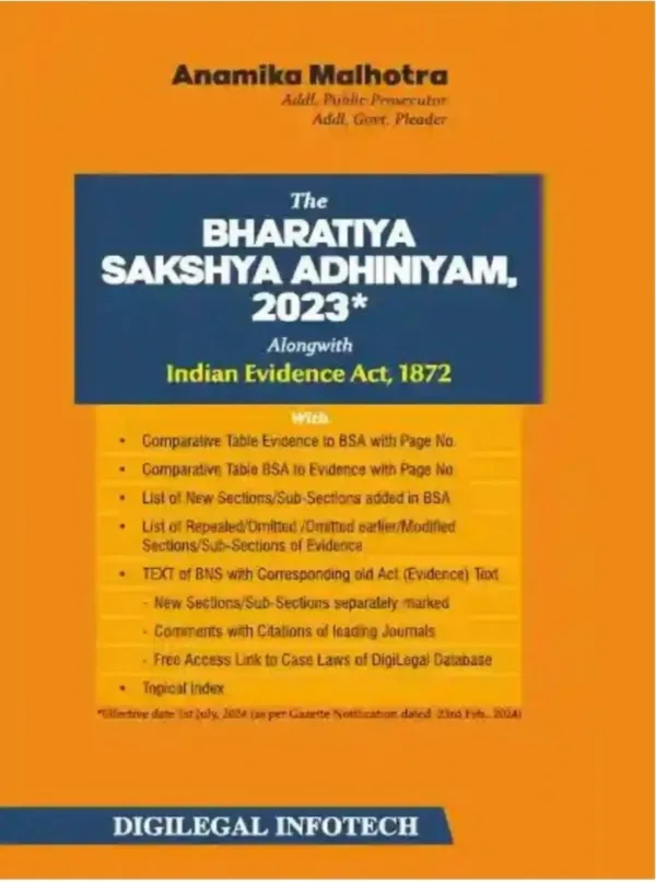 This authoritative volume presents the Bharatiya Sakshya Adhiniyam, 2023 in full, annotated with comparative tables linking each section to the Indian Evidence Act, 1872 — making it the definitive quick-reference for comparative law and courtroom practice. The book contains the Statement of Objects & Reasons, an arranged section-by-section text, a clear schedule (certification templates for electronic/digital records and expert certificates), and a practical topical index that speeds legal research. Notable updates are the formal recognition and admissibility of electronic and digital records with prescribed certification/hash requirements, an expanded scope of secondary evidence, and newly enumerated categories of judicially-noticeable facts — all explained with illustrations, cross-references and references to relevant case law. The volume also lists provisions omitted or repealed from the Indian Evidence Act and provides practitioner-oriented commentary on examination of witnesses, admissibility rules, presumptions, and burden of proof. Designed for immediate courtroom and classroom use, the book helps readers translate statutory change into courtroom strategy and academic analysis. Ideal for lawyers, judges, prosecutors, police investigators, law teachers and students seeking an up-to-date, usable compendium on evidence law in India.