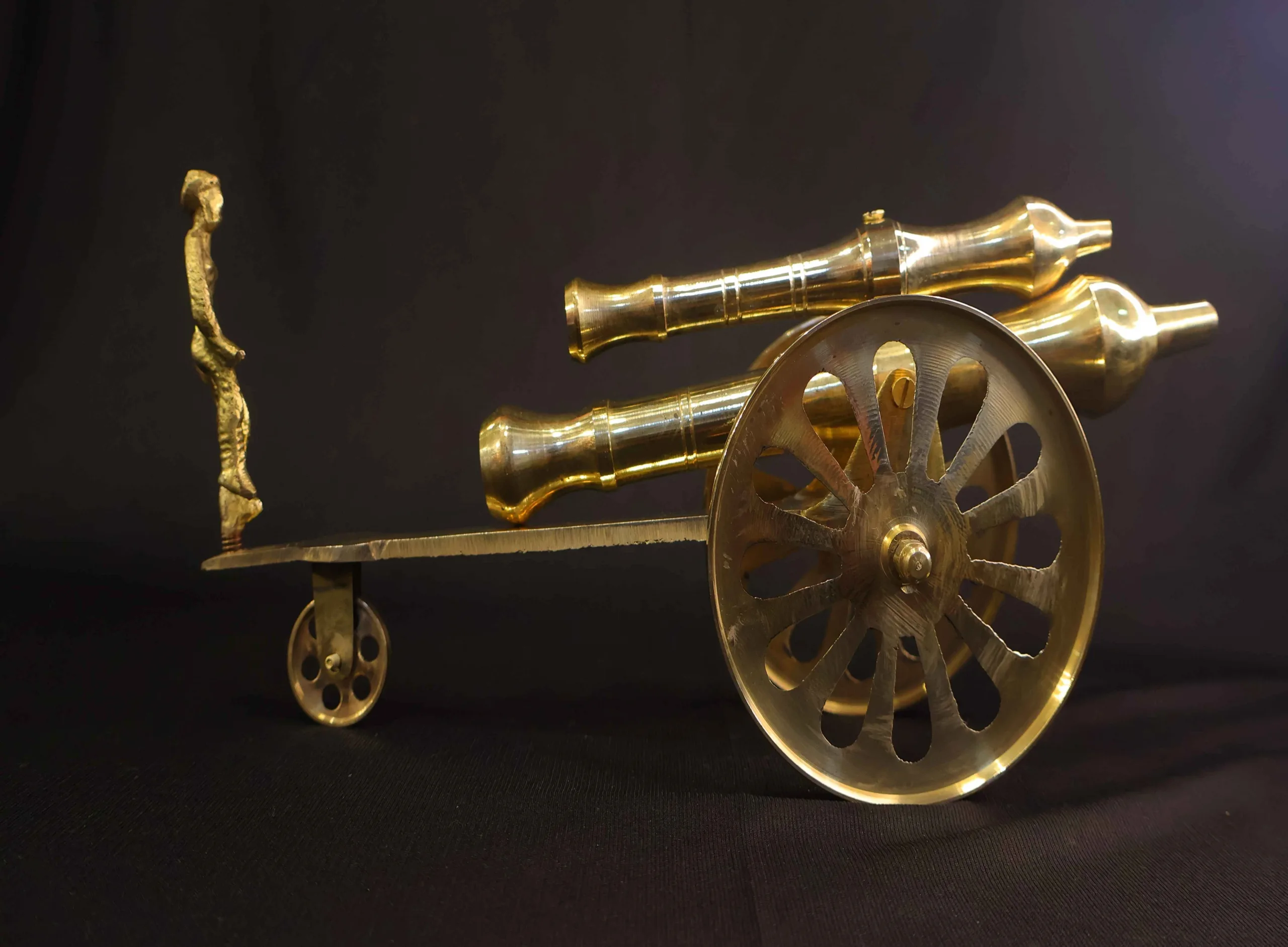 This polished brass cannon model is a beautifully compact decorative replica that blends historical character with artisanal presence. Crafted in warm-toned brass, the piece features large spoked wheels, twin stacked barrels and a small seated figurine on the rear platform that adds scale and personality. Subtle tooling marks and a natural patina underscore its handcrafted or small-batch nature, while the solid-feeling metal provides collectible heft. Sized for desks, shelves, mantels or display cabinets, the model reads equally well in vintage, industrial, study, or military-themed interiors—use it as an executive ornament, bookshelf accent, photography prop, or thoughtful gift for history buffs and collectors.