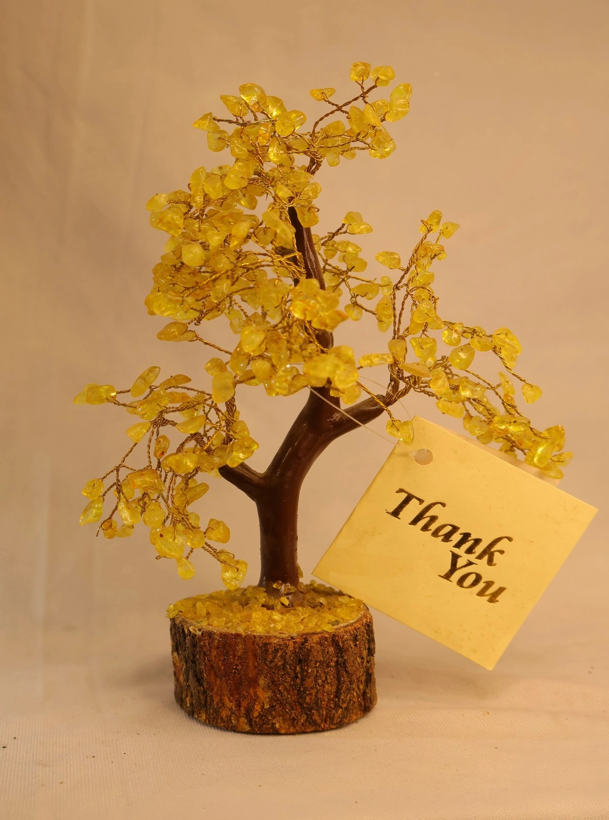 This handmade citrine gemstone tree blends artisanal metalwork with natural stone energy to create a compact, symbolic d?cor piece. Twisted gold-tone wires form the tree?s branches, each tipped with polished yellow citrine chips chosen for their warm hue and light-catching translucence. The tree is secured into a rustic wood-slab base finished with matching crystal chips and resin to ensure stability and an attractive presentation. Popularly used as a feng shui money tree, citrine is associated with abundance, confidence, and positive energy?making this piece ideal for placement on desks, near workstations, altars, or in living areas to uplift the space. Its petite scale is perfect for small desks and shelves, while its handmade variations in branch arrangement and stone shape make every piece unique.