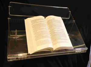 A crystal-clear acrylic reading & writing desk designed to hold books, documents, tablets and sheet music with a stable, angled surface and raised shelf. Its minimalist, transparent design keeps focus on the material displayed while blending into any modern environment. Hinged construction allows compact storage while delivering a sturdy, professional display platform.