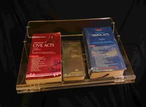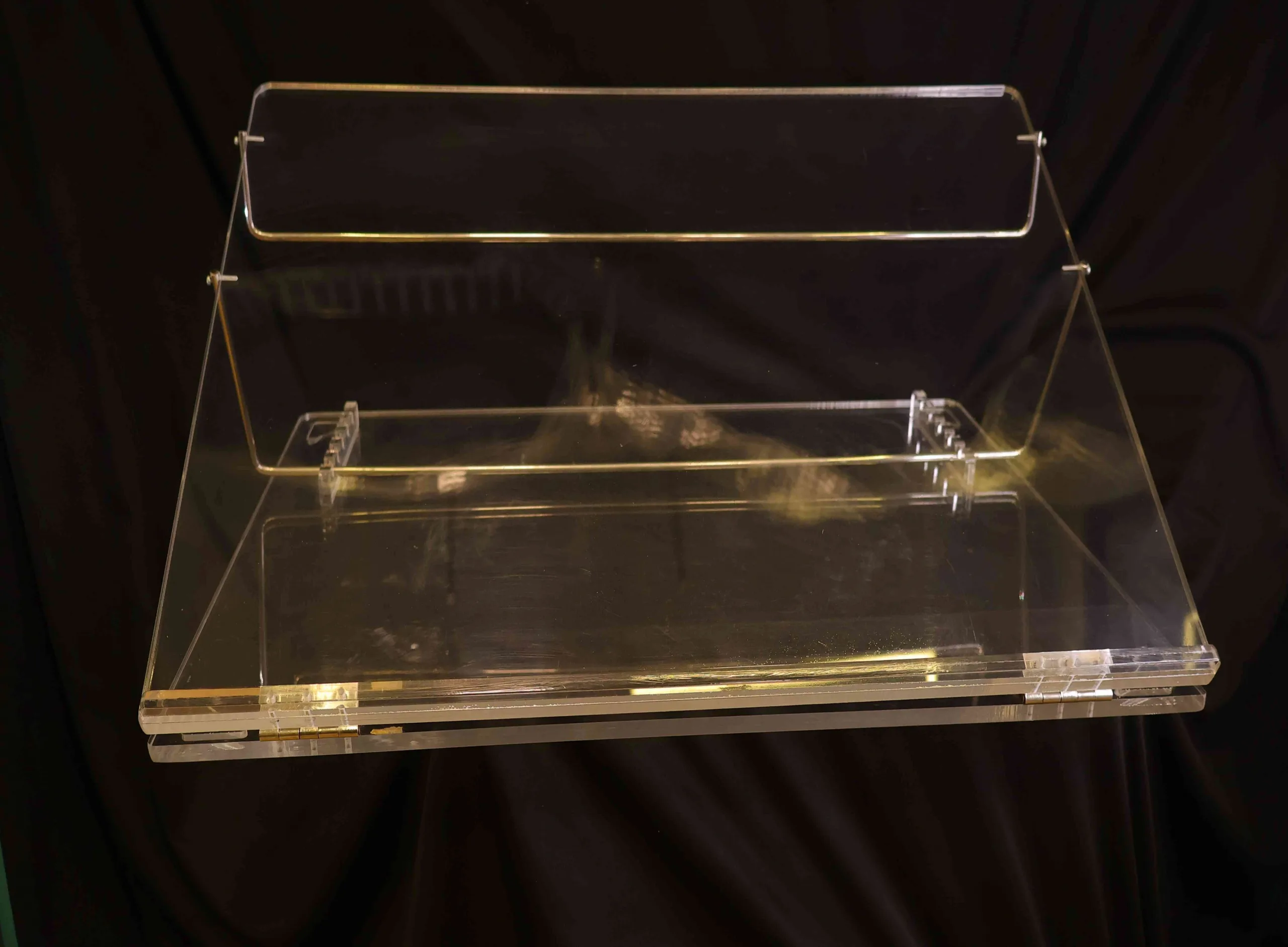 A crystal-clear acrylic reading desk that combines minimalist aesthetics with practical display performance. Crafted from high-clarity plexiglass, the angled desktop provides an ergonomic viewing and writing surface while the elevated shelf and front lip securely hold books, tablets, documents or sheet music in place. The visible hinge and layered plate construction deliver a robust, stable platform that still folds flat for space-efficient storage or shipping. Its transparent design reduces visual clutter, making it an ideal choice for retail counters, museum displays, reception areas, kitchens (cookbook use), classrooms, and professional lecterns where unobtrusive presentation matters. Lightweight for easy relocation but rigid enough for everyday use, the desk resists distraction and keeps attention on the displayed item.