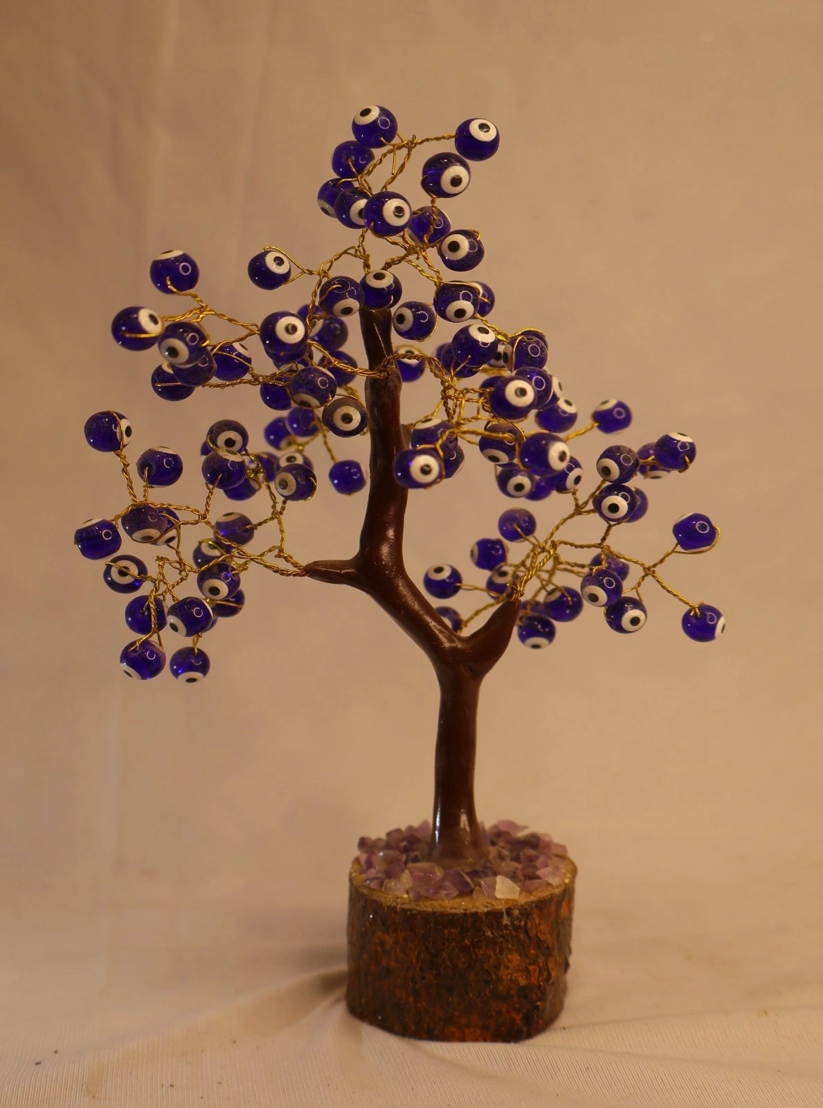 This handmade Evil Eye Beaded Protection Tree pairs timeless talisman symbolism with artisan craft to create a compact, eye-catching tabletop charm. Dozens of cobalt-blue glass beads?each painted with the distinctive white-and-black ?eye??are individually wrapped and twisted onto gold-tone wire branches, producing a full canopy that catches light and attention. The trunk is finished in warm brown for natural contrast and set into a rustic wood-slab base topped with amethyst chips that add color, weight, and energetic intention. Traditionally used as a protective amulet against negative energy, the evil eye motif is both decorative and meaningful: display it on a work desk, by an entryway, on an altar, or in a meditation corner to signal intention and invite calm.