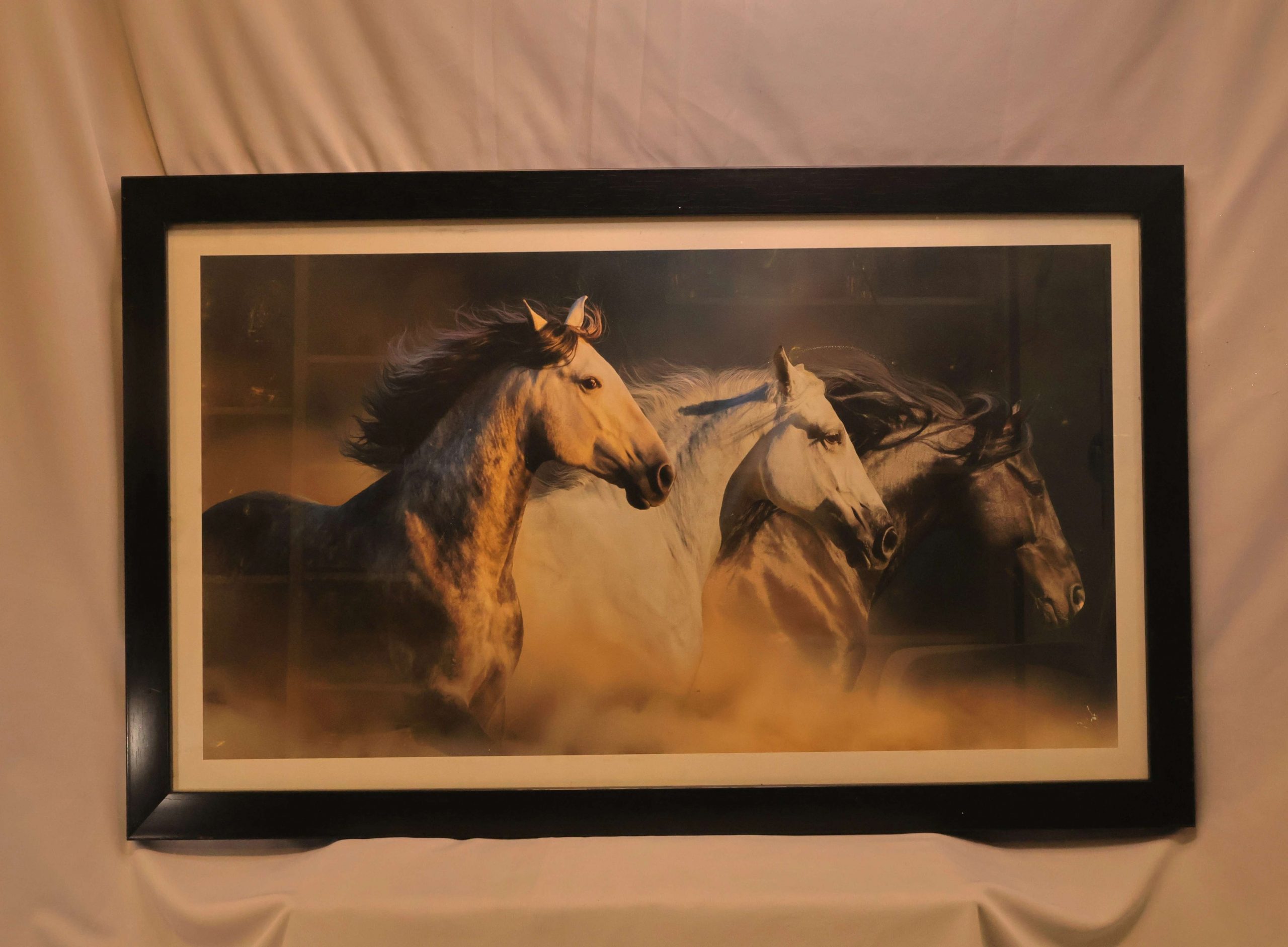 The Galloping Trio is a museum-quality framed photographic print that celebrates motion, light and equine grace. The composition focuses on three horses mid-stride emerging from atmospheric mist, their manes and musculature rendered in crisp detail and warm tones that add depth to any room. Produced on archival, acid-free paper using fade-resistant inks, the print is matted with a cream border that enhances contrast and framed in a durable black wood frame for a refined, gallery-ready presentation. Protective glazing preserves clarity while the sturdy backing and pre-installed hanging hardware make installation effortless. Sized to suit living rooms, executive offices, hotel lobbies, stables and dining areas, this piece works equally well in contemporary and traditional interiors.