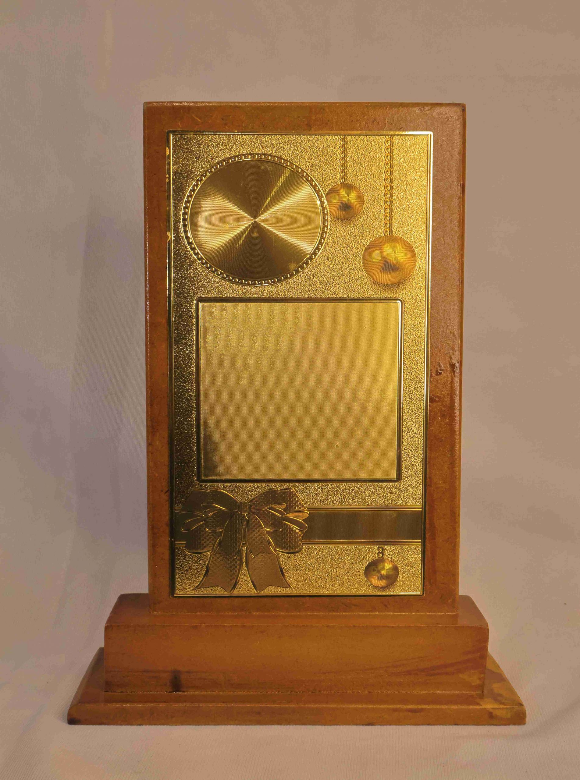 This festive gold-bow plaque blends celebratory design with practical customization to create a keepsake recipients will cherish. The polished wooden frame supports a richly textured gold-tone plate featuring a circular medallion, hanging ornament motifs and a decorative ribbon bow—making it especially well suited to holiday recognitions, end-of-year awards, and special achievements. The central rectangular panel is optimized for laser or rotary engraving, producing high-contrast names, dates, and short dedications that remain legible over time. Sized for desks and mantels, the stepped base ensures stable display while the overall weight conveys quality without being cumbersome to ship. Options include engraved text, logo inserts, protective lacquers, and gift packaging to present the plaque ready-made for ceremonies or corporate gifting programs. Whether used as an employee appreciation award, a volunteer recognition keepsake, or a festive gift for donors and partners, this plaque transforms recognition into a professional, presentable memento that highlights achievement and gratitude