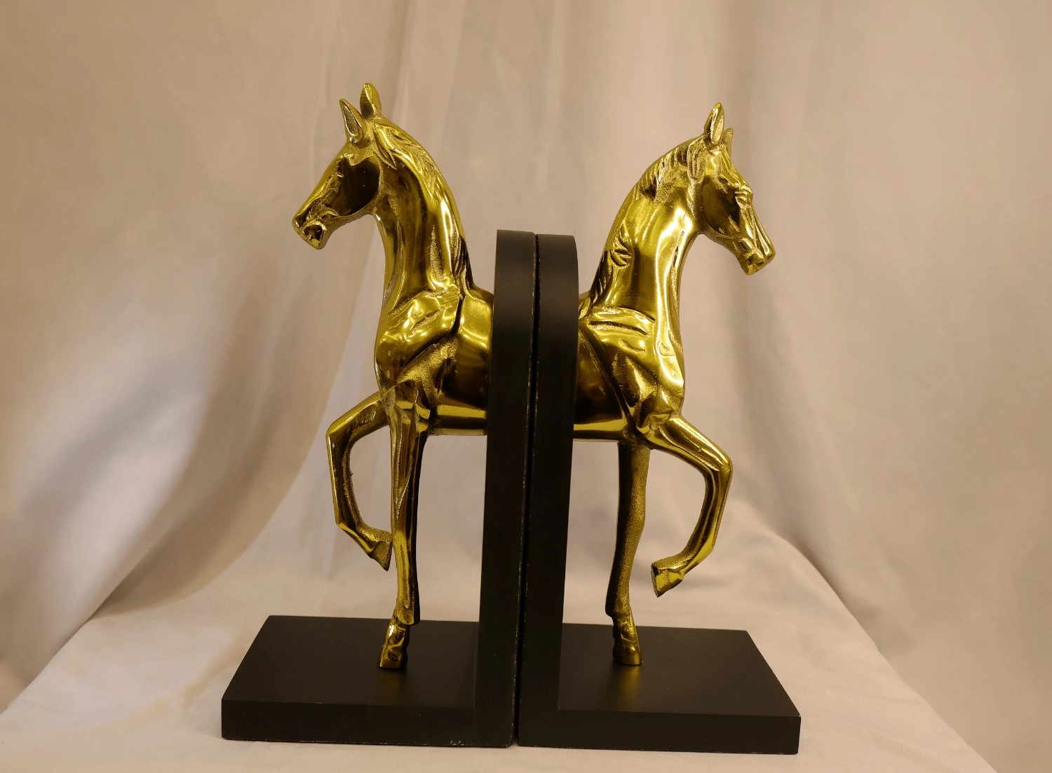Add refined equestrian charm to your interiors with this pair of gold horse bookends. Each piece features a detailed horse figure rendered in a high-gloss gold/brass finish, mounted on sturdy matte black bases for stability and contrast. The mirrored pair forms a seamless look when placed back-to-back, producing an elegant silhouette while securely holding books, magazines, or vinyl. Constructed from durable metal and finished for visual impact, these bookends balance aesthetic presence with functional weight ? they won?t tip under a normal load and protect surfaces when fitted with felt or rubber pads. Their versatile styling suits modern, mid-century, and traditional decors, making them ideal for living rooms, offices, libraries, or bedrooms. Whether used to frame a curated bookshelf or as a standout desk accessory, this set doubles as sculptural art and everyday organization. Dimensions, weight, and care instructions should be included on product listings to reassure buyers about load capacity and maintenance (dust with a soft cloth; avoid abrasive cleaners). Packaged attractively, they make a thoughtful gift for horse lovers, collectors, and design-forward homeowners.