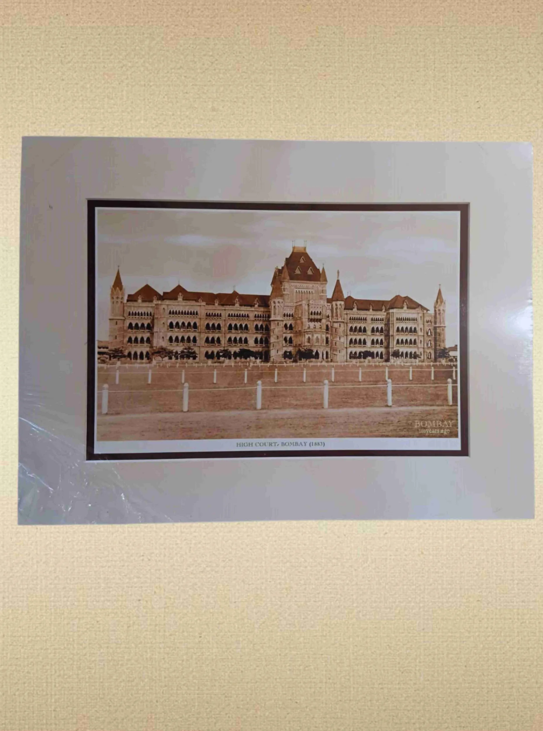 This mounted frame artwork features a historic photograph of the High Court of Bombay, dated 1878. The sepia-toned image captures the architectural grandeur and judicial legacy of one of India’s oldest high courts. It serves as a refined décor piece for professional and heritage-inspired spaces.