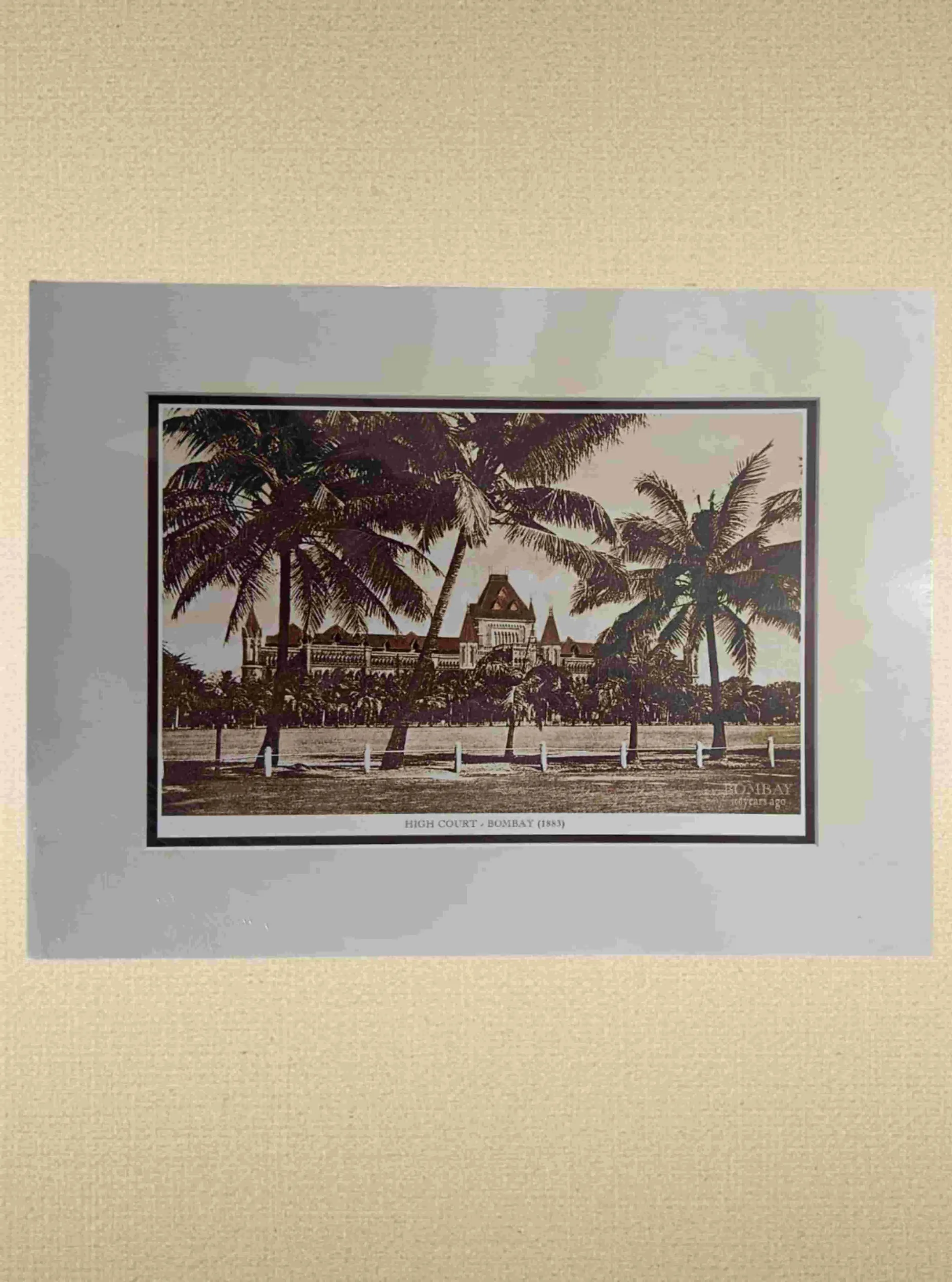 The High Court – Bombay (1883) Mounted Frame is a distinguished piece of heritage wall décor that reflects the authority, tradition, and architectural elegance of India’s judicial system. This historic photograph captures the Bombay High Court as it stood in 1883, uniquely framed by palm trees that emphasize Bombay’s colonial-era landscape and tropical environment.