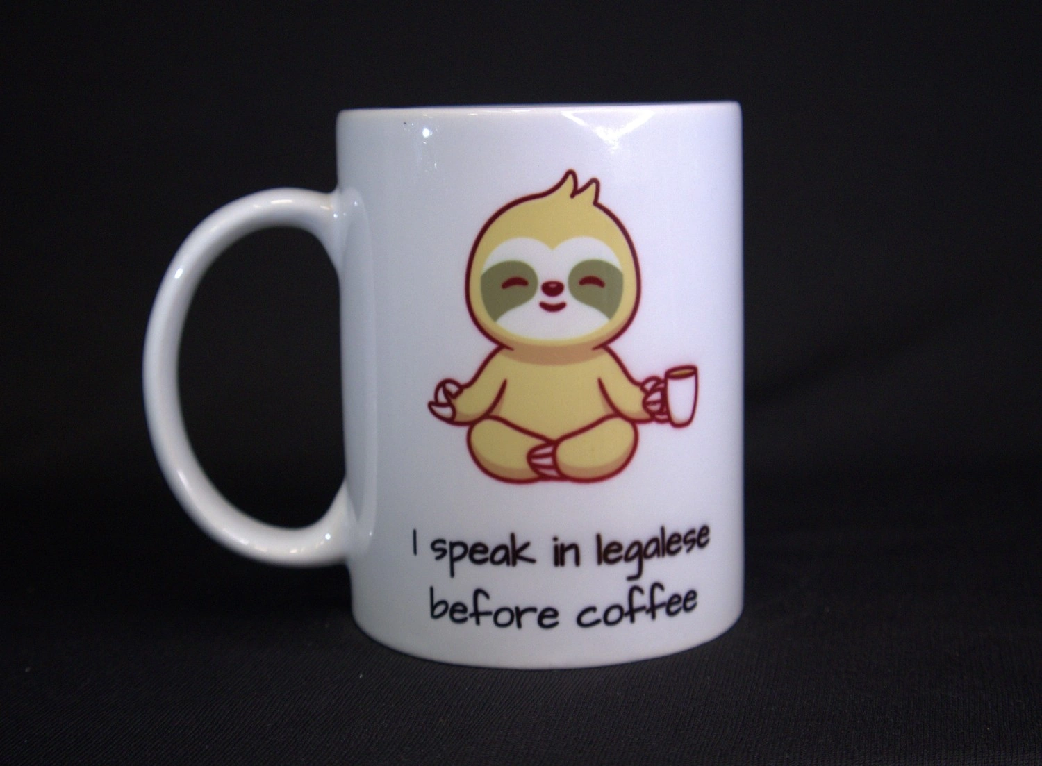 This glossy white ceramic mug features an adorable meditating sloth and the witty slogan “I speak in legalese before coffee,” blending profession-specific humor with playful design. Comfortable to hold and photo-friendly, it’s perfect for morning coffee at the office, study sessions, or as a desk conversation piece. An ideal, lighthearted gift for lawyers, law students, paralegals, and anyone who appreciates legal humor.