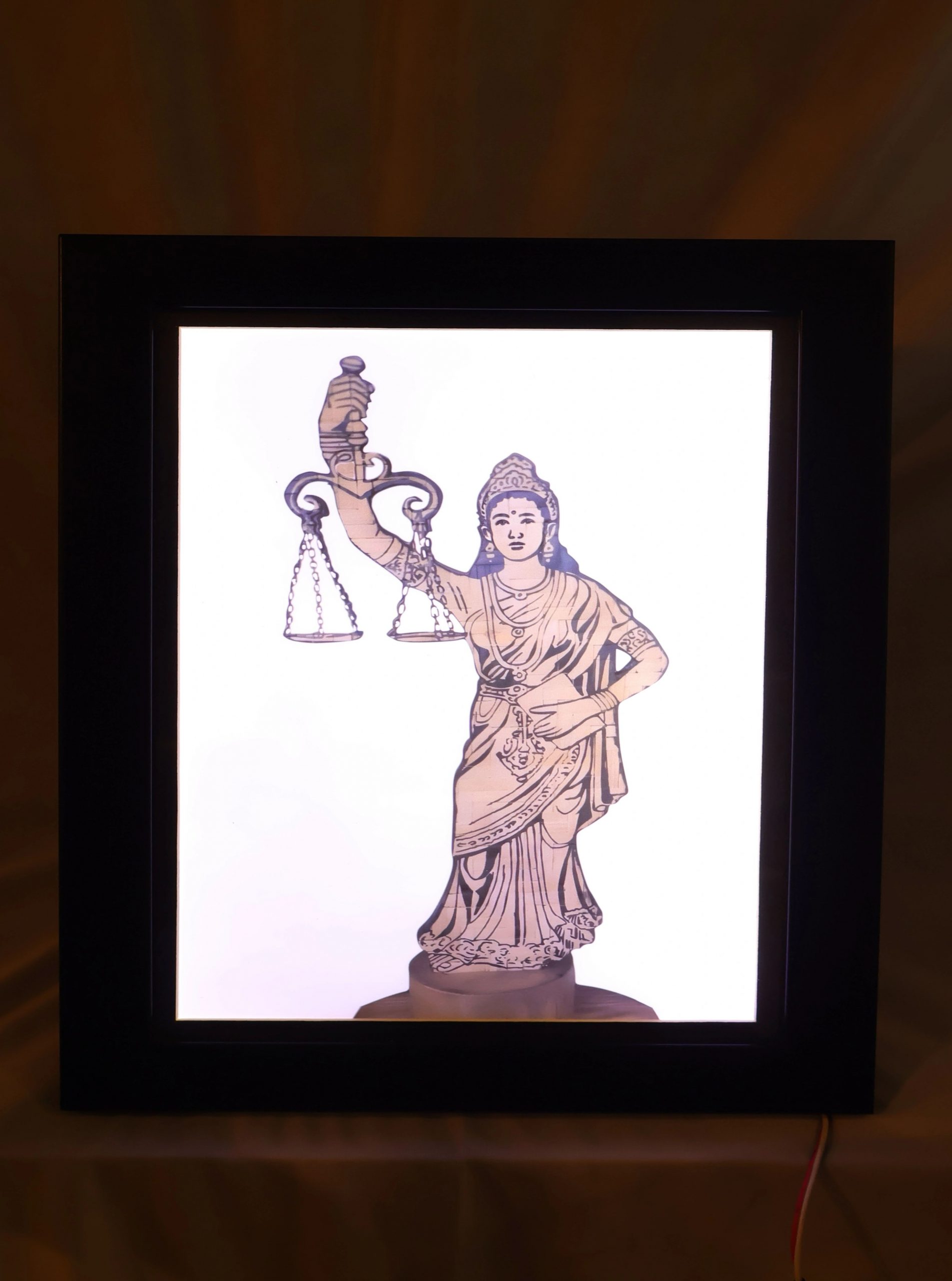 A contemporary, backlit Lady of Justice print housed in a sleek black frame with integrated LED illumination, designed to balance symbolism and modern office aesthetics. The glowing white background sharply highlights the scales-and-figure illustration for strong visual presence in reception areas, conference rooms, or award displays. Plug-and-play mounting makes it a presentation-ready piece for law firms, courts, and legal institutions.