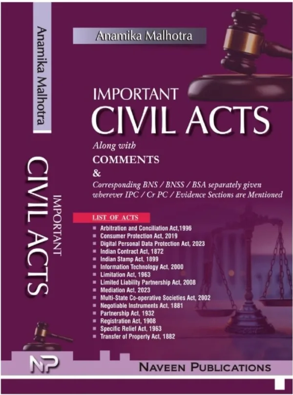 Important Civil Acts (Anamika Malhotra) is a practical, exam-and-practice-oriented statutory compendium that assembles the most-used civil enactments in a single volume with concise commentary. Each Act is presented with the statutory text followed by focused comments, illustrations and practitioner notes that clarify scope, key definitions, exceptions and drafting/pleading implications. The volume covers Arbitration & Conciliation Act (1996), Indian Contract Act (1872), Transfer of Property Act (1882), Specific Relief Act (1963), Consumer Protection Act (2019), Digital Personal Data Protection Act (2023), Mediation Act (2023), Limitation Act, Partnership Act, Registration Act and allied statutes — plus relevant stamp and negotiable instruments provisions. Wherever civil provisions intersect with criminal or procedural law, the book provides corresponding BNS / BNSS / BSA references (and Evidence/CrPC/IPC pointers), helping readers map statutory interplays quickly. The layout emphasizes speed: clear headings, boxed notes, and cross-references for citation conversion and classroom revision. Whether used for LLB exam preparation, quick courtroom reference or drafting support, this compendium reduces research time and provides reliable statutory commentary for students, junior advocates and legal educators.