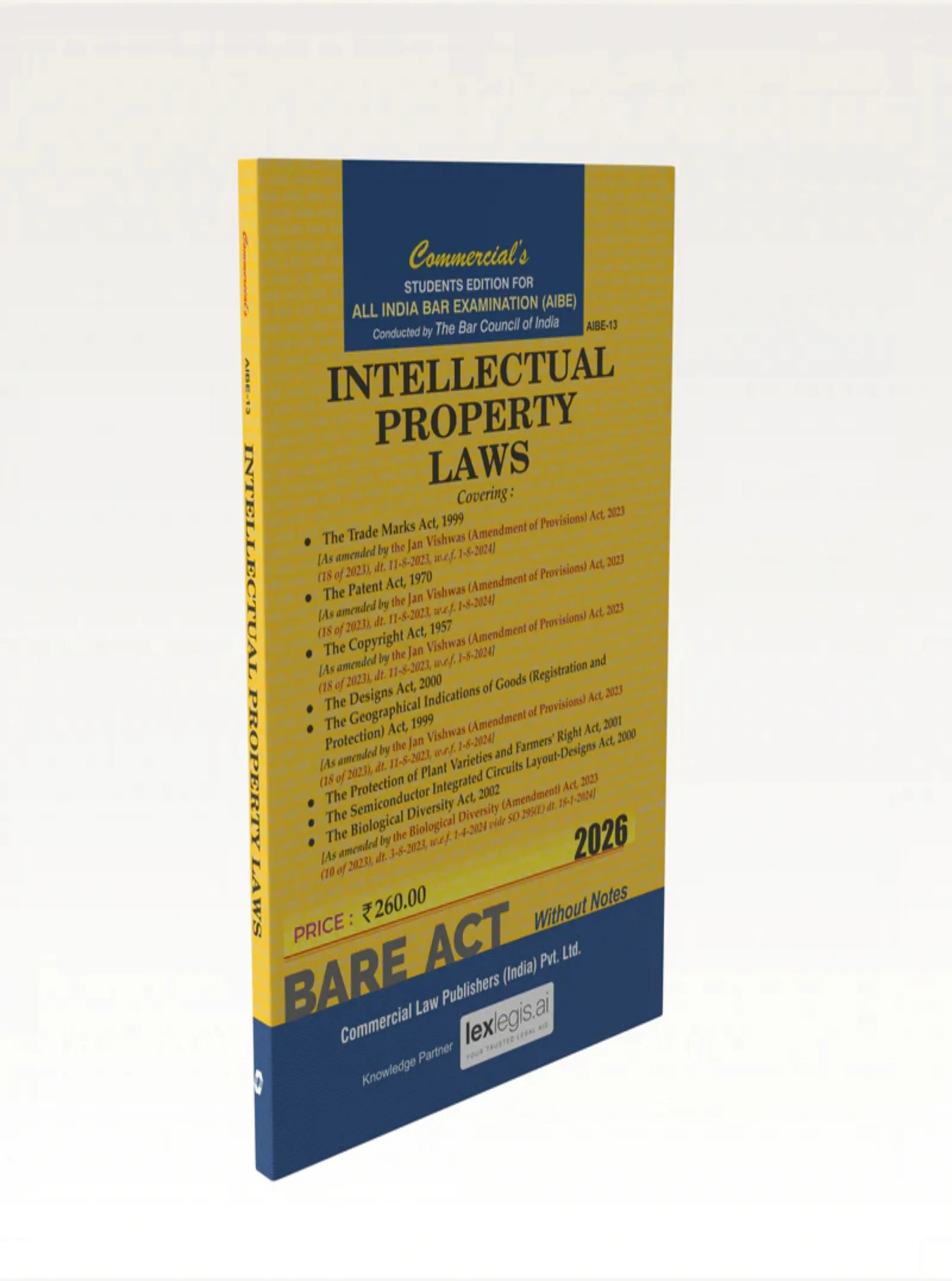Intellectual Property Laws (AIBE) is a single-volume, practical compendium designed to meet the needs of Bar exam candidates and junior IP practitioners. The book reproduces the operative text of the Patents Act, Trade Marks Act, Copyright Act, Designs Act and the Geographical Indications Act alongside concise, plain-language annotations that clarify definitions, scope and key exceptions. Each chapter highlights landmark judicial pronouncements with short, annotated case briefs that show how courts interpret core provisions; procedural flowcharts (e.g., prosecution, opposition, revocation), “must-remember” statutory bullets and model short answers help rapid exam preparation. Practical sections deal with registration workflows, drafting basics (claims, assignment, licensing), enforcement remedies (injunctions, damages, Anton Piller orders, customs relief) and cross-border compliance notes (TRIPS/Berne references). The layout is optimized for quick retrieval — a keyword-driven table of contents, sectional indexes and exam checklists ensure users can go from concept to citation in seconds. Whether used for AIBE revision, classroom study, or initial practice at the desk, this compendium converts complex doctrine into clear, actionable study and practice aids. (For statutory authority, see official Acts: Patents, Trade Marks, Copyright, Designs and GI).