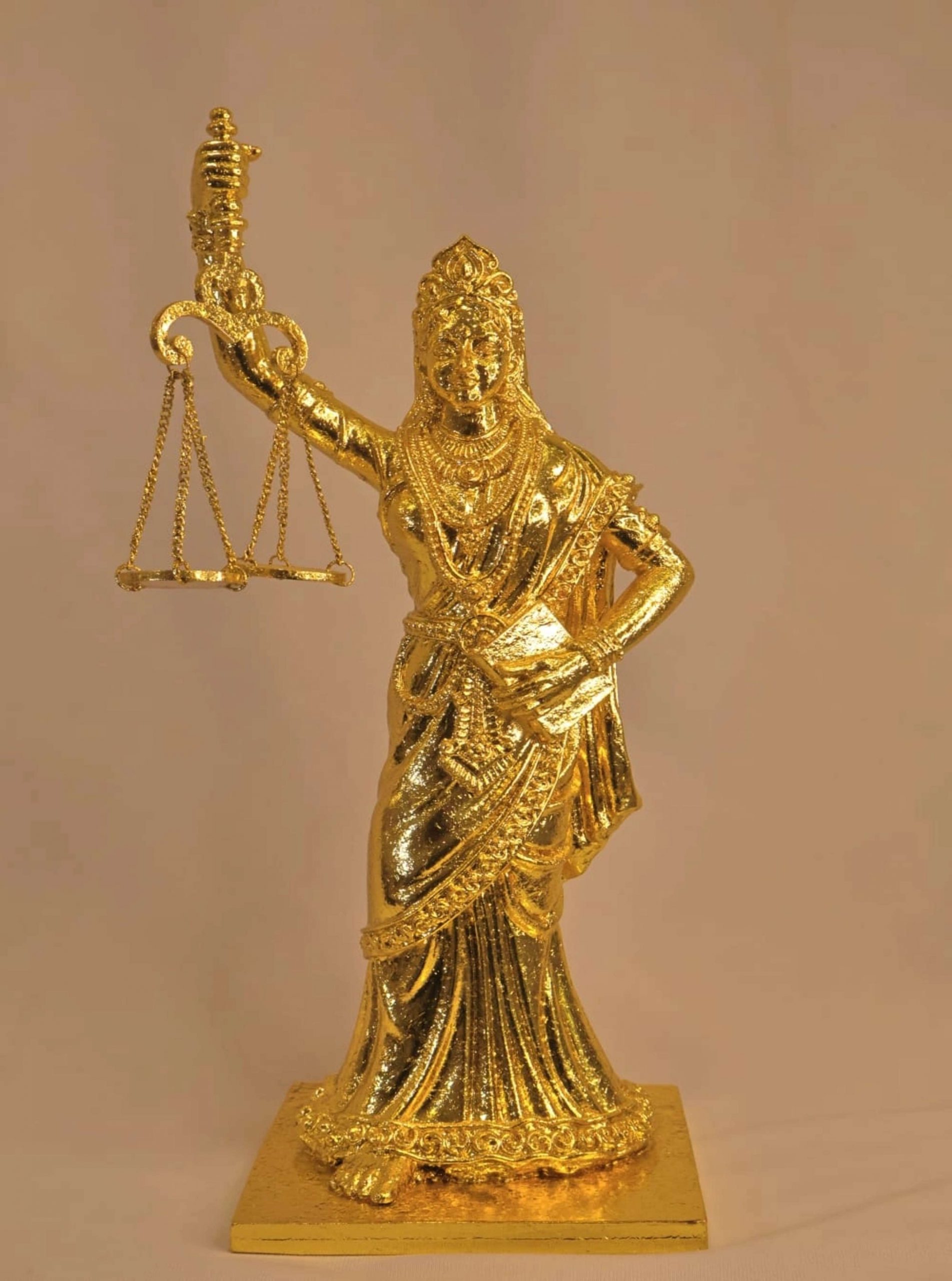 A gilded Lady Justice statuette rendered with the classic blindfold, balanced scales, and a book, finished in a radiant gold tone and mounted on a square base. The ornamental detailing and polished finish make it an eye-catching centerpiece for reception desks, shelves, or award displays. Purpose-built as a symbolic gift and professional décor item, it communicates dignity and legal gravitas.