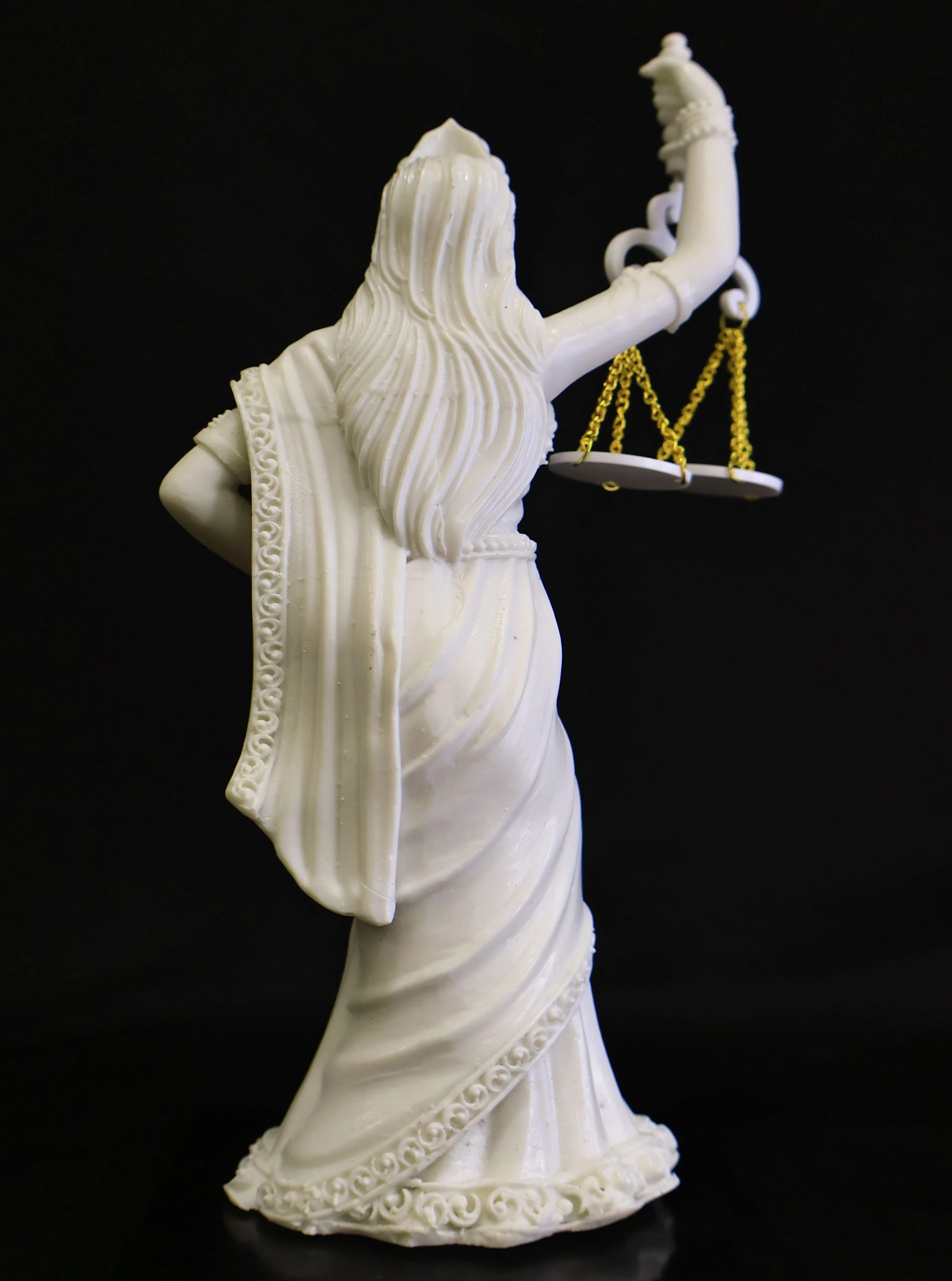 This Lady Justice statuette blends classical symbolism with decorative craftsmanship to produce a compelling emblem of law and fairness. Finished in a deep bronze-look patina, the figure raises a finely scrolled scales arm while holding a closed book — a visual pairing that represents balanced judgment and legal knowledge. The sculpted drapery, ornamental borders, and hand-finished details read clearly at close range, while the square base ensures stable display on desks, shelves, or ceremony plinths.Use as law office décor, a commemorative gift for bar admission or retirement, or as part of an award presentation where symbolic gravitas matters. Options such as a personalized plaque, engraved base plate, or boxed presentation can be added to increase perceived value and gifting suitability. The statue’s unobtrusive footprint pairs with an authoritative silhouette, making it equally suited for professional, academic, and ceremonial contexts where the values of justice, impartiality, and legal scholarship are being honored.