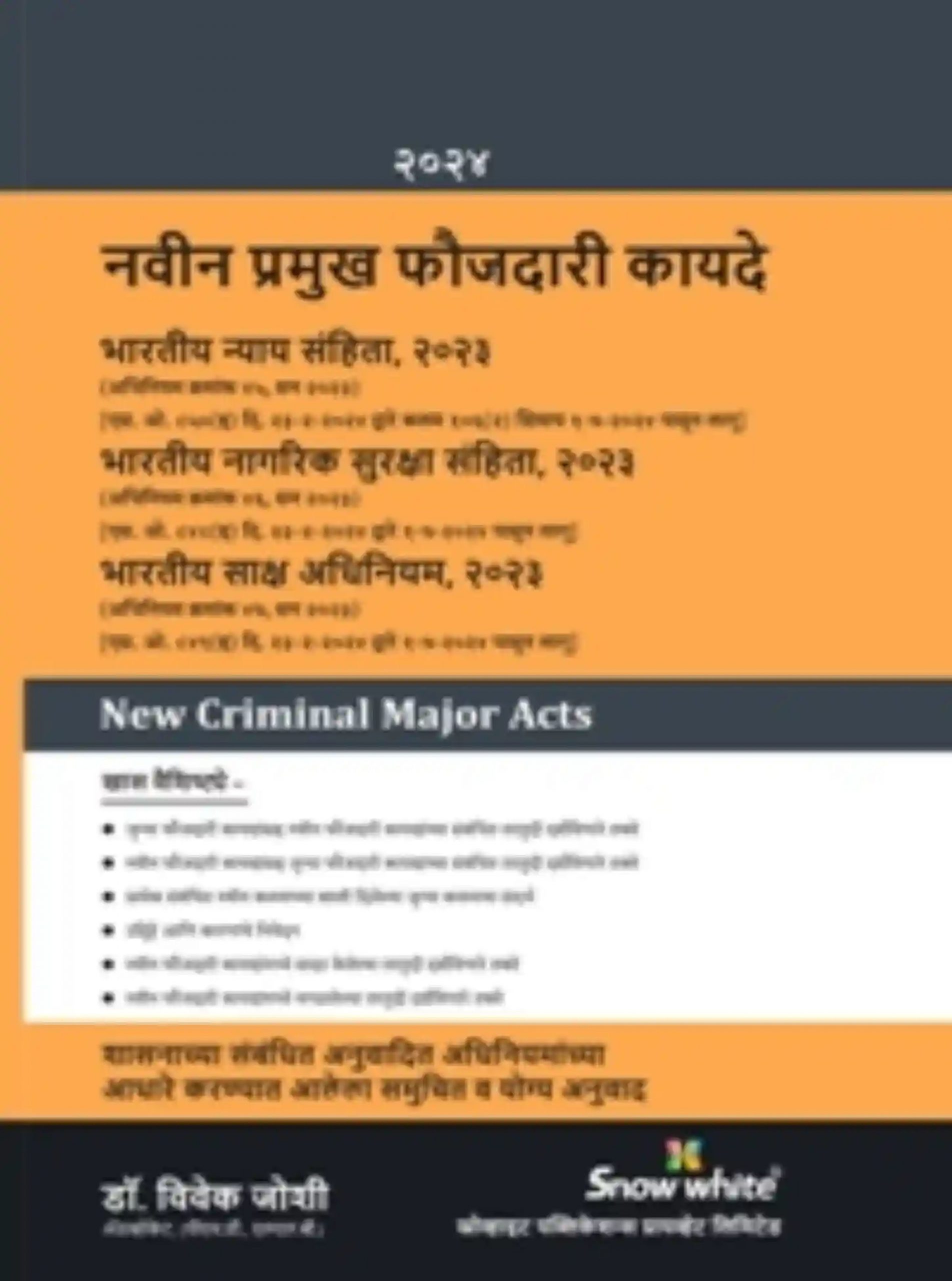 This book provides a complete Marathi compilation of the New Criminal Major Acts 2024—covering the Bharatiya Nyaya Sanhita, Bharatiya Nagarik Suraksha Sanhita, and Bharatiya Sakshya Adhiniyam. It enables readers to understand India’s restructured criminal law framework through updated definitions, offences, procedures, and evidence rules. Designed for easy reference, it is essential for students, practitioners, and all stakeholders adapting to the 2024 reforms. The book helps practitioners and students transition from the IPC–CrPC–Evidence Act framework to the new regime by highlighting modernized provisions such as electronic evidence, community service, organized crime definitions, terrorism-related offences, and updated procedural safeguards. It also covers essential concepts related to arrest, bail, trial processes, investigation timelines, forensic requirements, and digital record-keeping under BNSS. This edition is designed to serve as a reliable reference for court work, academic study, competitive examinations, and institutional training. It ensures that lawyers, police personnel, judicial officers, and learners can easily understand and apply the transformed criminal justice system in Maharashtra and beyond.