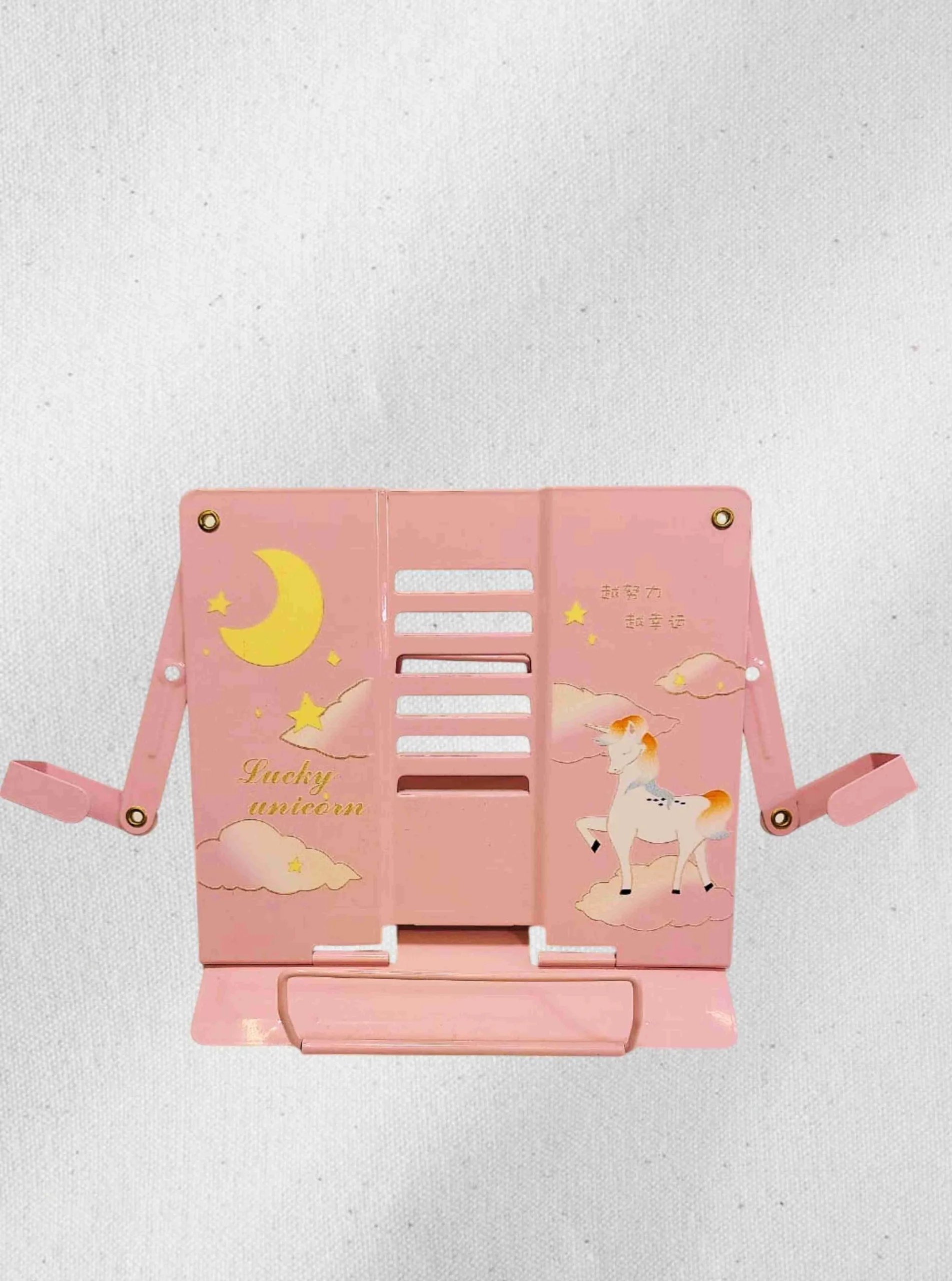 A compact, foldable pink book/tablet stand decorated with a crescent moon, stars and a whimsical unicorn motif. Features ventilated back panel, adjustable angle hinges, fold-in page straps and a front lip to keep books or tablets secure. Lightweight and portable — ideal for reading, studying, recipe-viewing or hands-free tablet use.