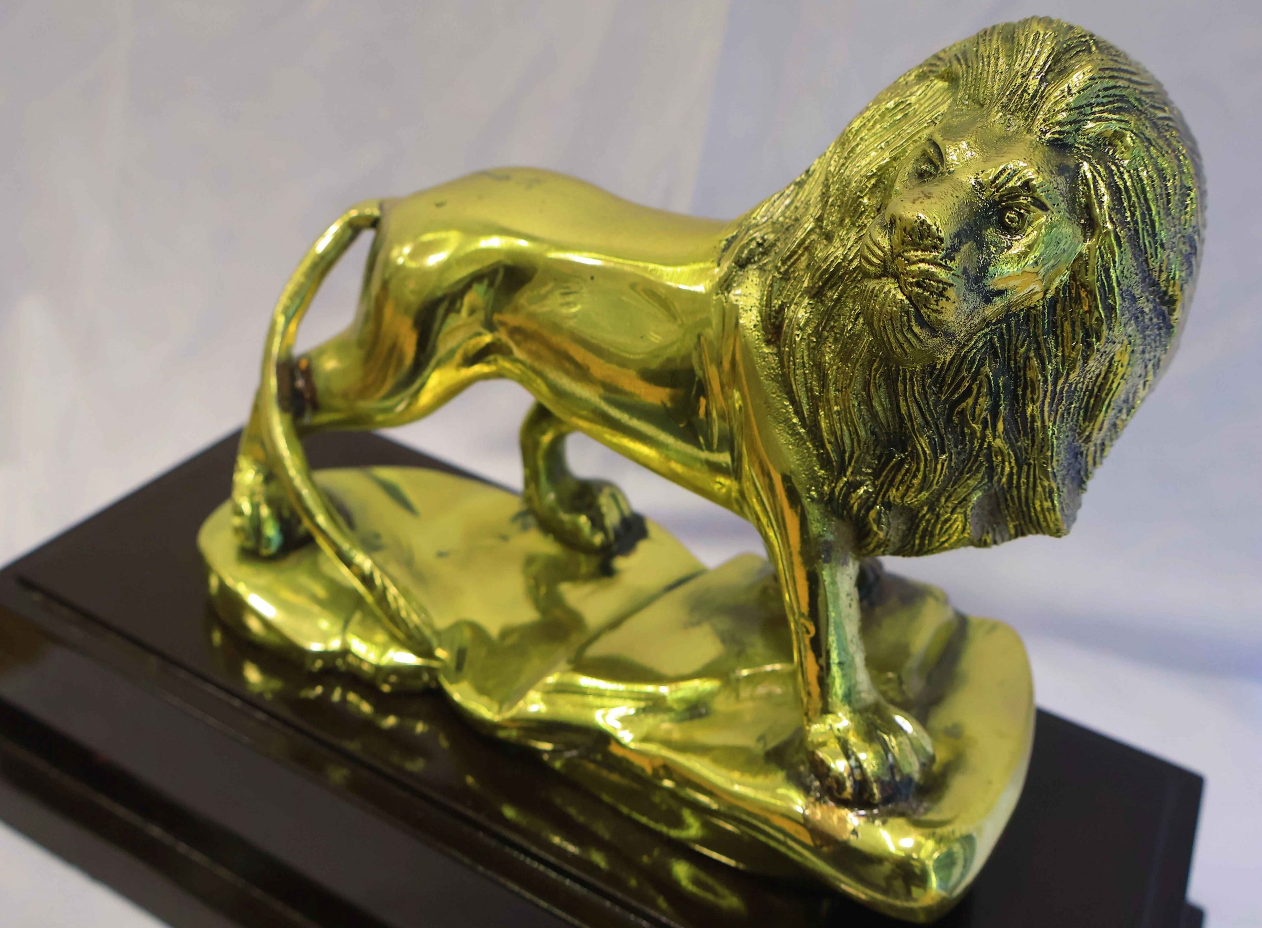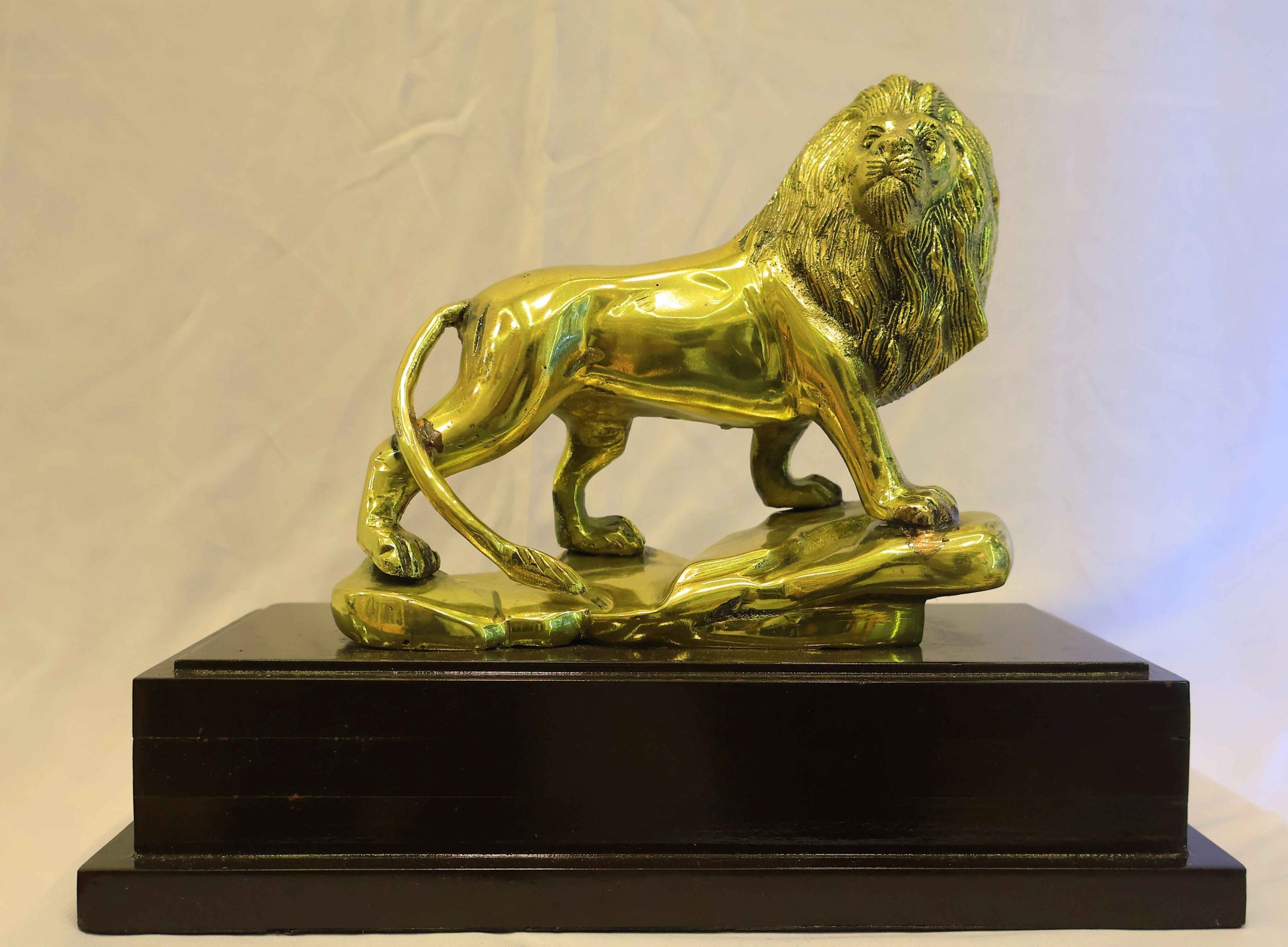 A polished brass lion statue mounted on a lacquered wooden plinth, crafted as a decorative sculpture or award-style ornament. The piece projects strength and leadership through a classic, lifelike pose and high-gloss finish. Ideal for mantel displays, executive desks, or as a prestigious corporate gift.