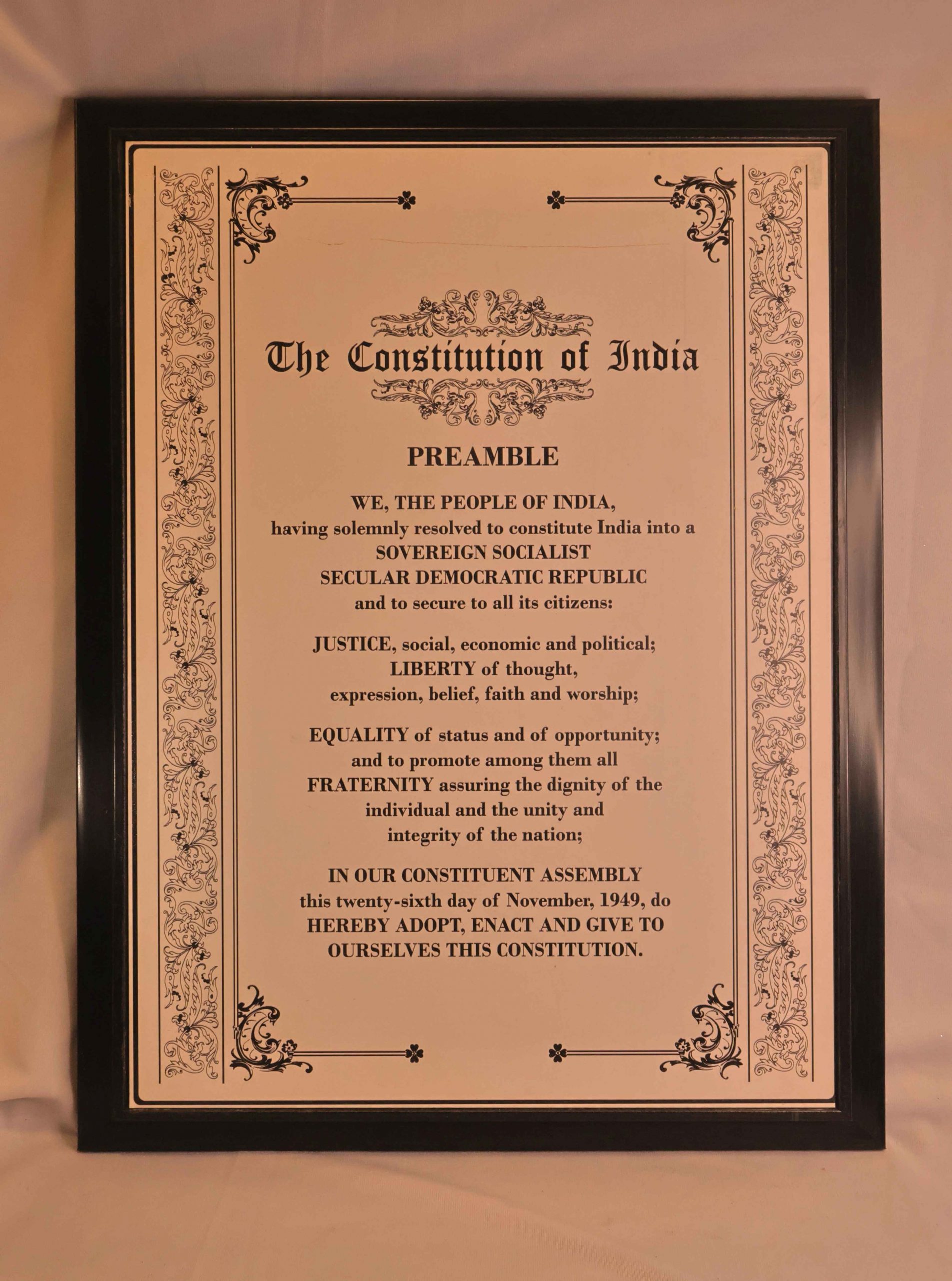 This museum-grade framed reproduction of the Preamble to the Constitution of India pairs typographic clarity with refined presentation to create an authoritative display piece. Printed on heavyweight, acid-free archival paper with pigment-based inks, the Preamble text is reproduced with exacting legibility and framed within an ornate decorative border that honors the document’s ceremonial character. The piece is finished with museum matting and the Distressed Sagewood Frame with Gold Fillet — a hand-finished, subtly weathered sage-green wood frame accented by a narrow gold inner fillet that adds warmth and formality without overpowering the text. Designed for institutional use, classrooms, law offices, court reception areas and civic centers, the framed Preamble functions both as a teaching aid and a commemorative artwork.