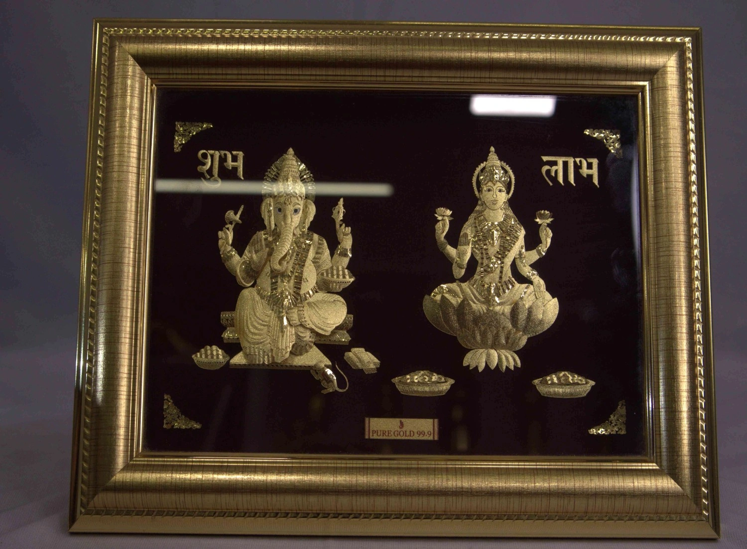 This exquisite artifact showcases a stunning representation of Goddess Lakshmi and Lord Ganesha created with 99.9% pure gold detailing, making it both a devotional masterpiece and a premium collectible. The radiant gold artwork stands out beautifully against the deep maroon background, symbolizing wealth, prosperity, wisdom, and auspicious beginnings. The inclusion of “Shubh” and “Labh” further enhances its blessings-oriented theme, making it especially meaningful for homes and business environments.