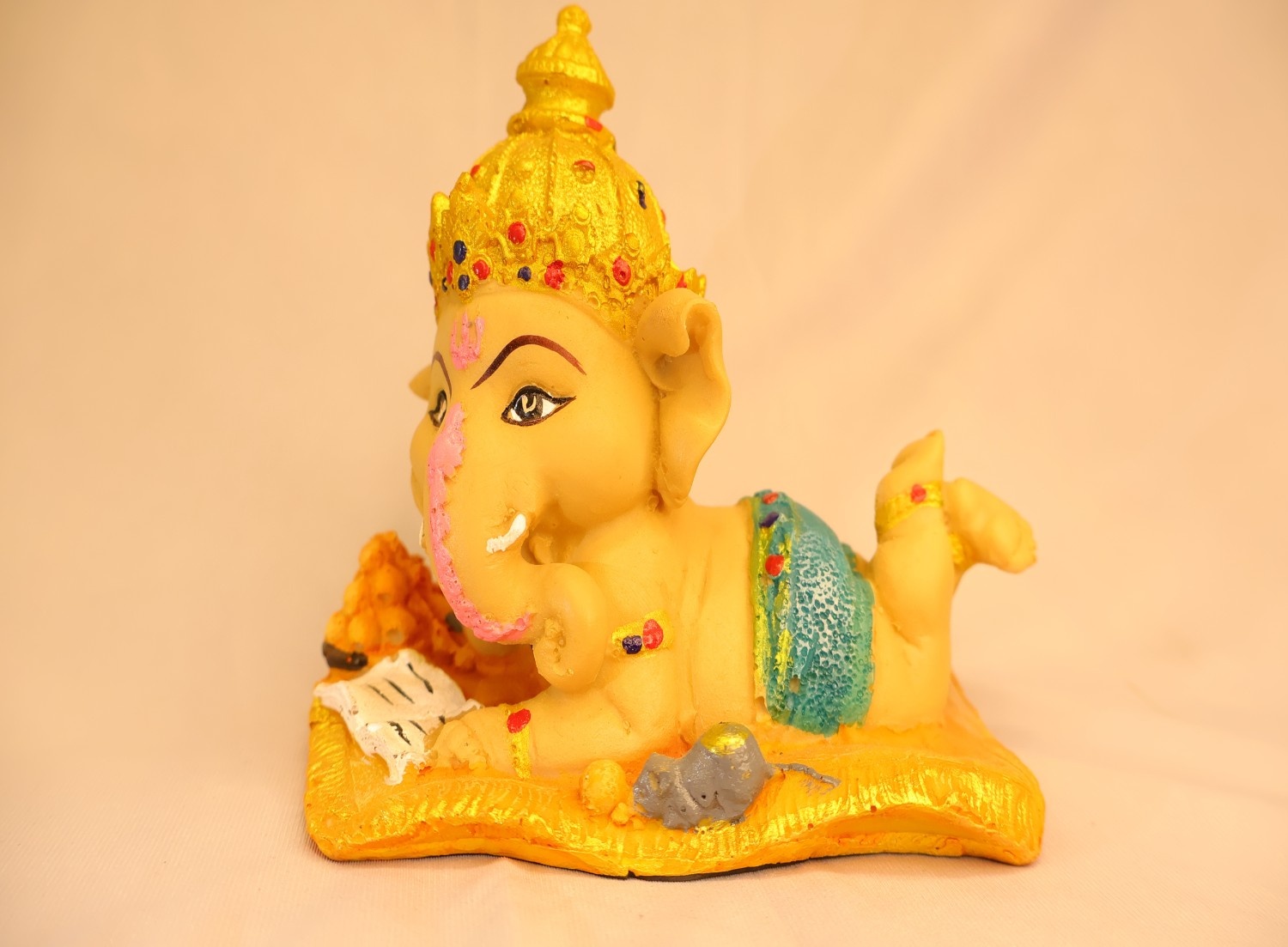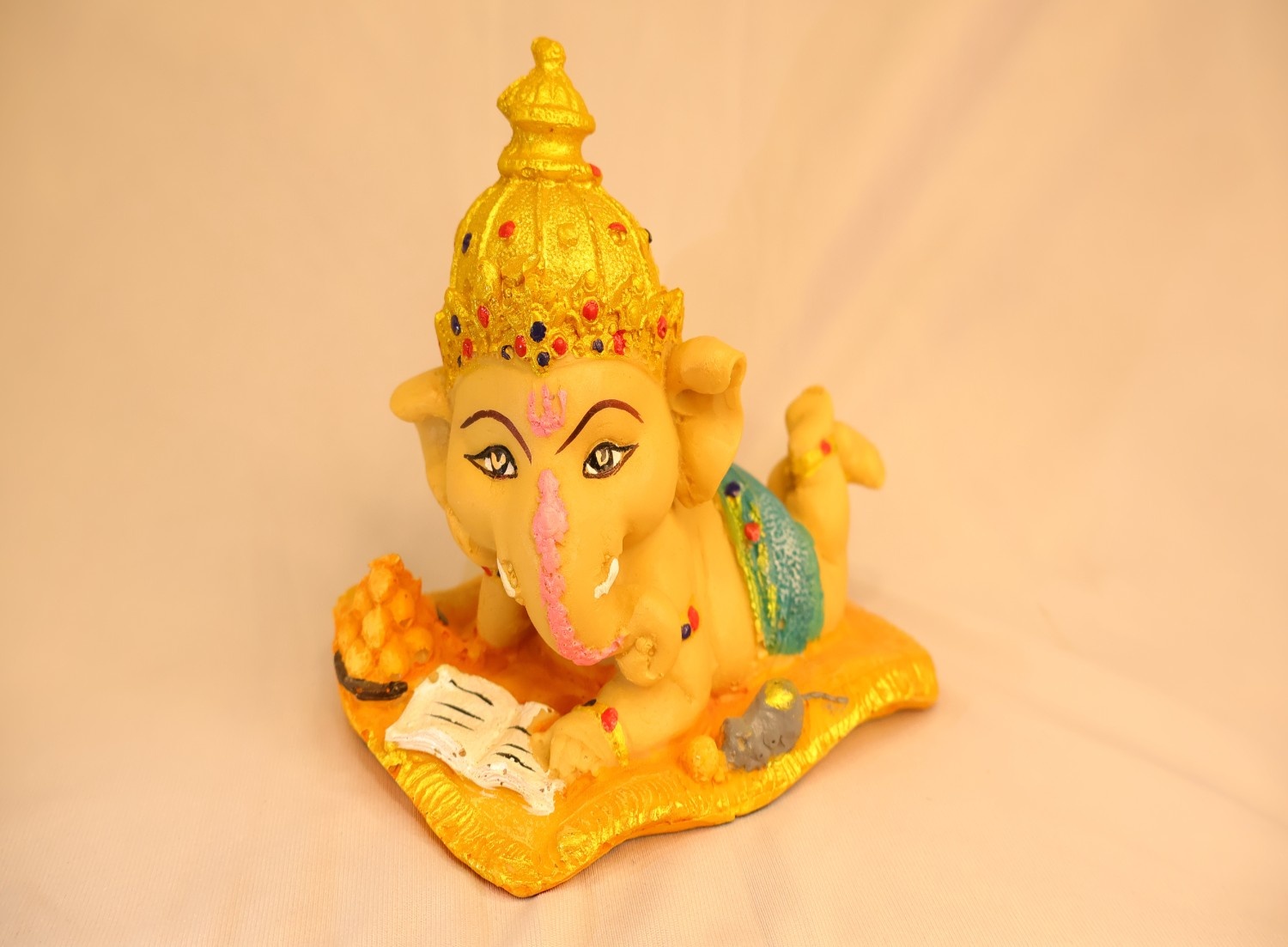 This Reading Ganpati statue is a charming, hand-painted depiction of Lord Ganesha reclining comfortably on a golden cushion while reading a book. Crafted with careful attention to facial expression, tilak details, and vibrant color accents, the figurine blends devotional meaning—Ganesha as patron of learning—with cozy, bookish character that suits study nooks, libraries, home altars, and office desks. Compact and lightweight yet visually striking, the piece works as a spiritual talisman that also encourages focus and curiosity. Ideal listing details to include: material (resin/ceramic/metal), height/width, weight, finish (hand-painted or factory), and care instructions (dust gently; avoid abrasive cleaners). Packaged securely, it makes an excellent gift for students, teachers, book lovers, or as a unique housewarming present. Whether used during Ganesh Chaturthi celebrations or displayed year-round, this Reading Ganpati offers both devotional charm and decorative warmth—an inviting accent that sparks conversation and elevates any bookshelf or altar.