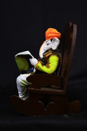 • Ganesha (Ganpati) seated in a wooden rocking chair reading a book