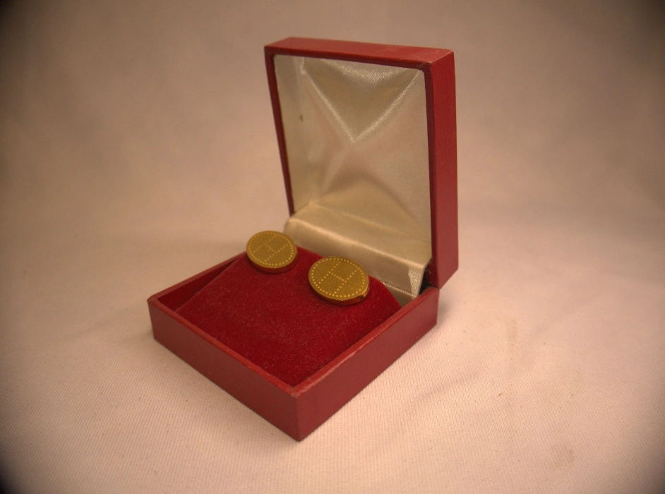 A classic pair of round, coin-style cufflinks in a bright gold-tone finish. The face of each cufflink features a simple, engraved monogram or logo—specifically, an ‘H’ enclosed within a circular design. They are presented in a striking square red presentation box with a red velvet base and a cream or white satin lid lining, suggesting a formal and personalized accessory.