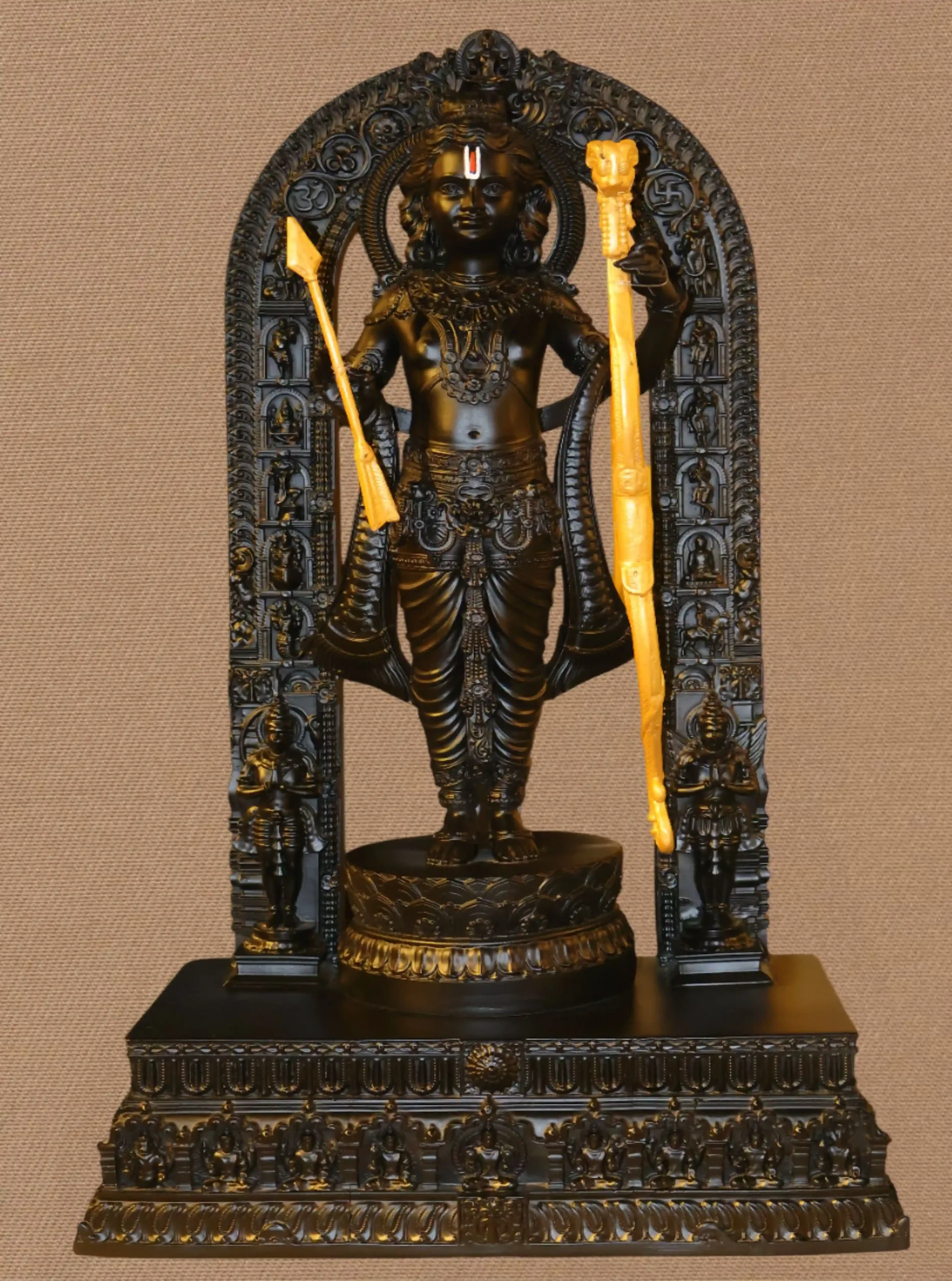 This exquisite Shree Ram statue presents Lord Rama in a dignified standing pose, set within a carved torana (arch) and positioned on a richly ornamented pedestal. Rendered in a deep black finish that accentuates finely carved drapery and jewelry details, the figure is highlighted with gilded elements—most notably the staff/bow—producing an elegant black-and-gold contrast that reads both ceremonial and contemporary. The torana and base are elaborately worked with miniature figures and floral motifs, reflecting traditional temple architecture and artisan tooling. Ideal for home puja rooms, temple installations, festive displays (Ram Navami, Diwali) and gifting for weddings or housewarmings, the statue combines devotional purpose with decorative presence. Hand-finished variations in patina and gilt are to be expected and indicate authentic craftsmanship.