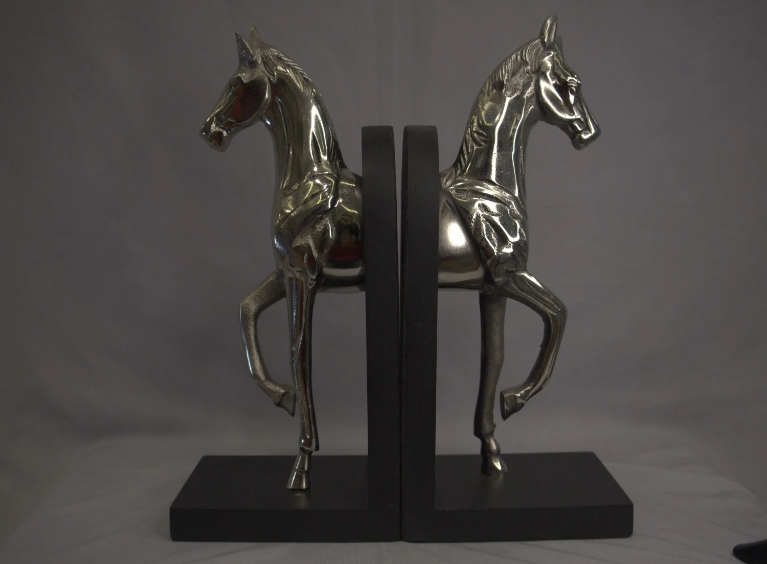 This is a pair of sculptural silver horse bookends finished in a warm brass tone and set on matte black bases. The mirrored design creates a dynamic, balanced silhouette that secures books while serving as an elegant focal point. Built for display and function, they bring equestrian style and polished flair to shelves, desks, and mantels.