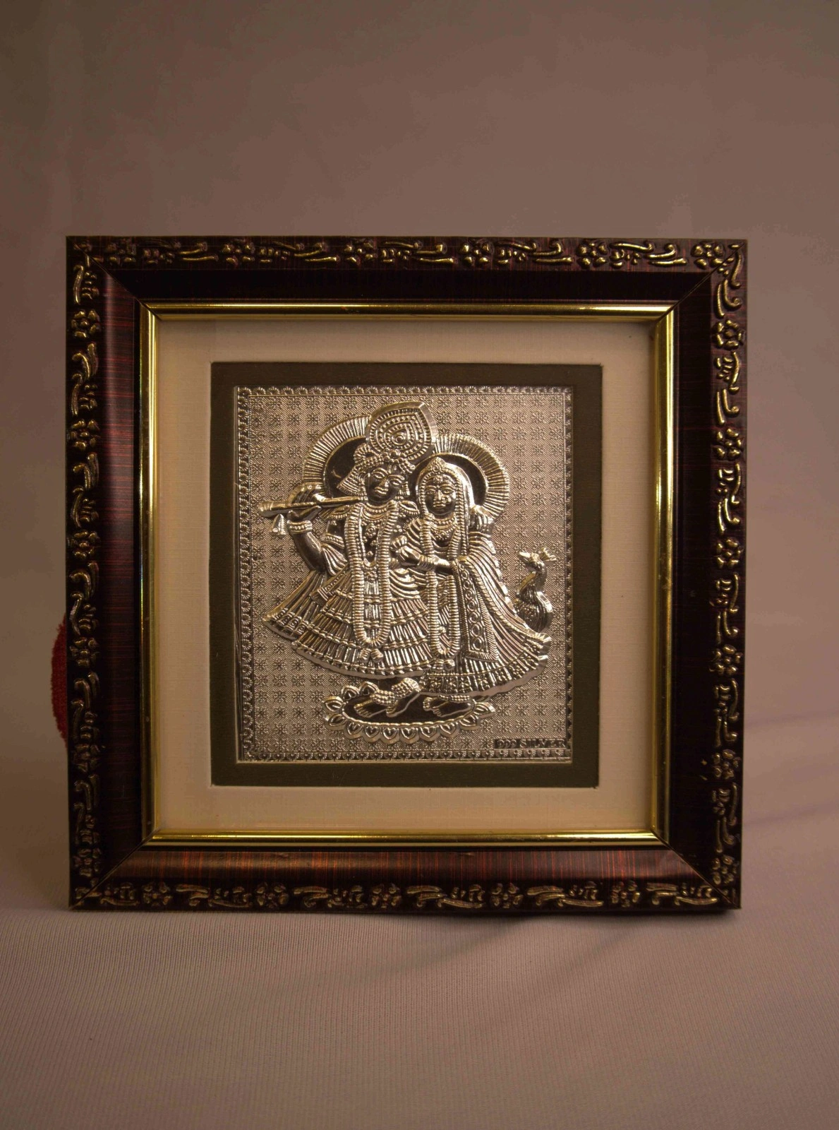 This exquisitely crafted artifact features a stunning silver embossed depiction of Radha Krishna, renowned as the divine couple symbolizing eternal love, devotion, and spiritual unity. The detailed metallic artwork is set within a high-quality wooden photo frame, finished in a rich dark brown tone with luxurious golden ornamental borders, enhancing its traditional and elegant aesthetic. The contrasting combination of silver artwork and warm brown-gold frame creates a visually striking presentation that stands out beautifully in any setting.