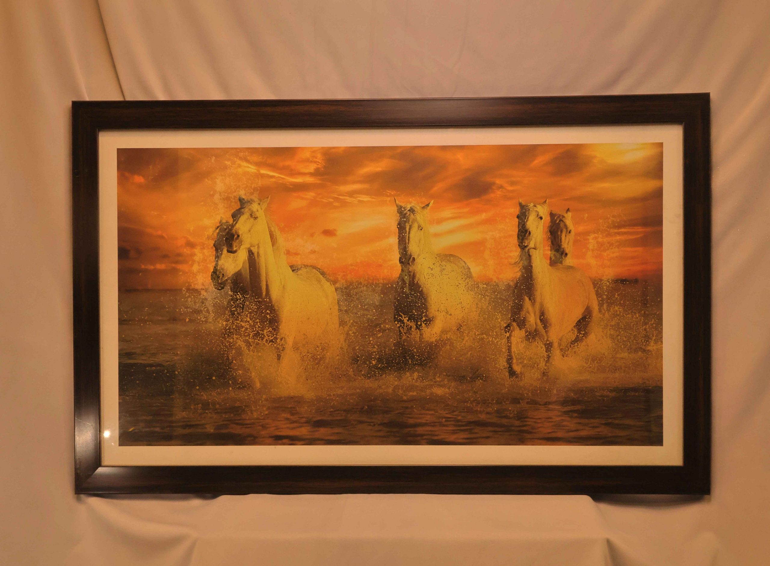 Sunset Gallopers captures four horses galloping through surf at dusk — a dramatic study of motion, spray and warm sunset color. The archival print is matted in cream and fitted into an espresso wood frame, arriving ready to hang. It’s a gallery-quality piece that adds dynamic energy and timeless elegance to residential and commercial interiors.