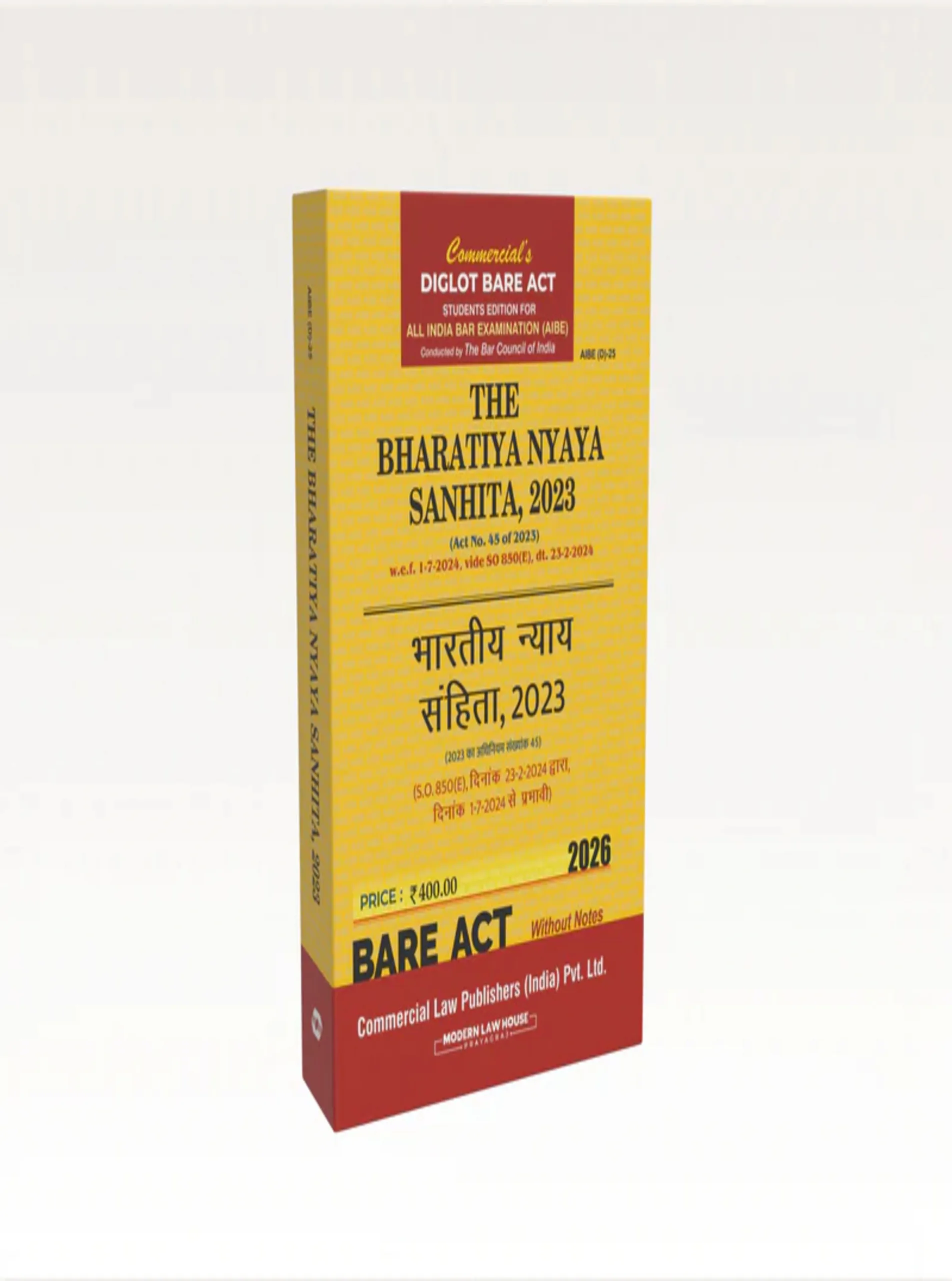 The Bharatiya Nyaya Sanhita, 2023 (AIBE Diglot Edition) codifies India’s modern criminal law in both Hindi and English for clarity and accessibility. It provides a structured guide to offences, penalties, law enforcement powers, and procedural reforms. Designed for AIBE aspirants, lawyers, and criminal law professionals, it also includes comparative tables with IPC sections to facilitate understanding and practical application.