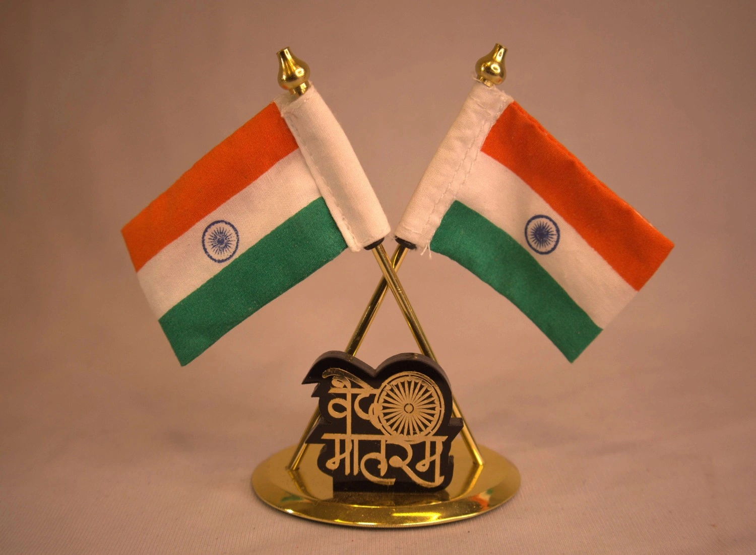 This product is a decorative desk stand featuring two crossed Indian national flags on a golden metal base, with “Vande Mataram” in Hindi and a chakra motif at the front. It’s designed as a compact patriotic showpiece for desks, reception counters, shelves, or car dashboards. Ideal for national celebrations, offices, schools and gifting, it blends pride, décor, and devotion in one artifact.