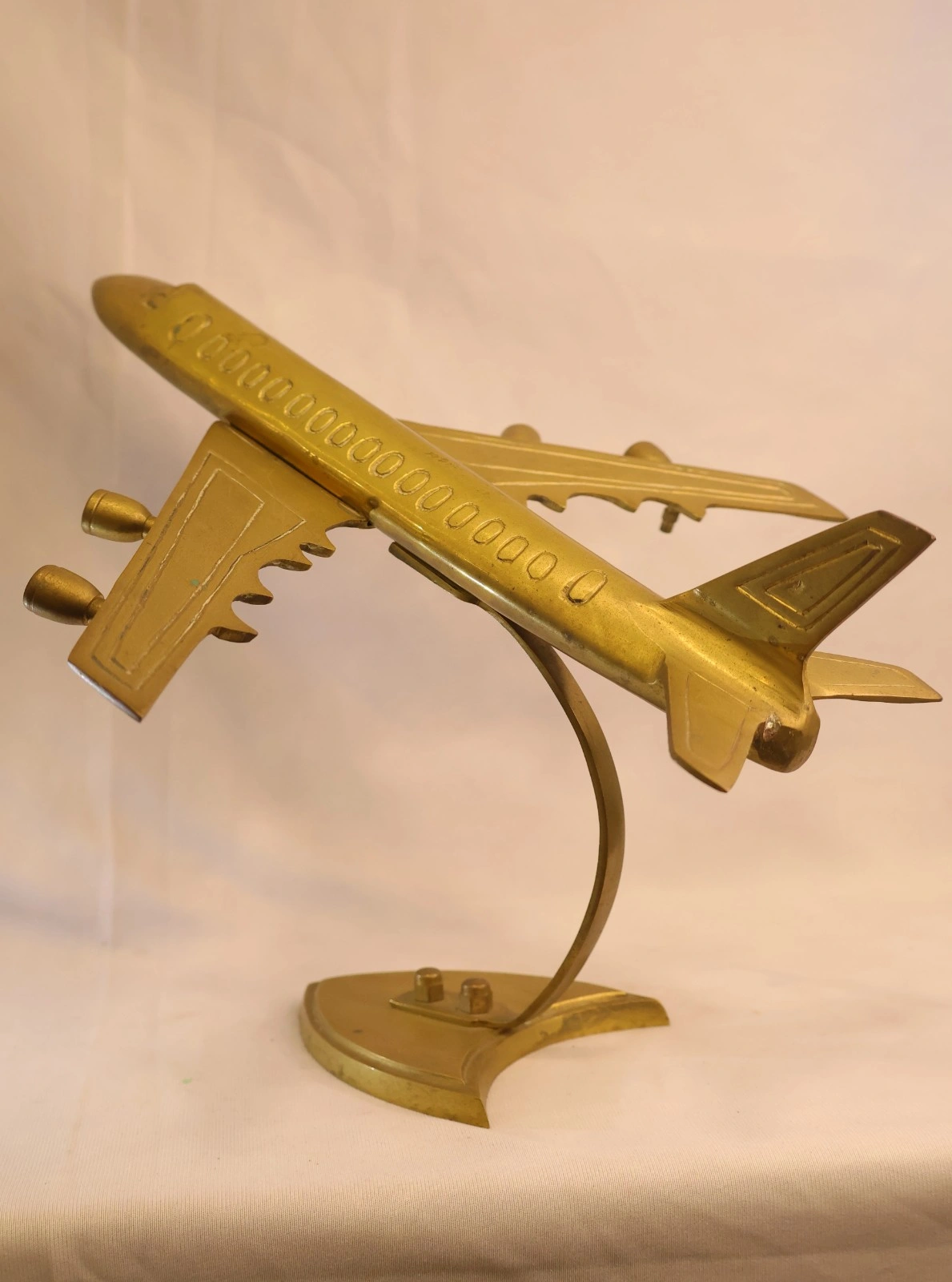 This vintage brass airplane showpiece brings mid-century aviation flair to any interior. Cast and finished in warm brass tones, the model sits on a graceful curved stand that creates a sense of motion and lift — a stylistic nod to flight. The sculpted fuselage, stylized windows and wings are subtly detailed, giving the piece visual weight without overwhelming a desktop or shelf. At a medium, display-friendly scale it functions equally well as an office conversation starter, mantel accent, or centerpiece in a travel-themed collection. The durable metal construction and aged brass patina offer both longevity and an authentic retro look; small surface variations and patina add character and confirm its artisanal or vintage provenance. Lightweight enough to reposition but substantial enough to sit confidently on furniture, this showpiece ships well when packaged with protective padding. Care is simple: wipe with a soft, dry cloth; apply a gentle brass polish sparingly if you want to restore extra sheen. Ideal for aviation enthusiasts, interior stylists, and corporate gifting, this brass airplane blends nostalgic design with everyday functionality — a refined collectible that celebrates the romance of flight.