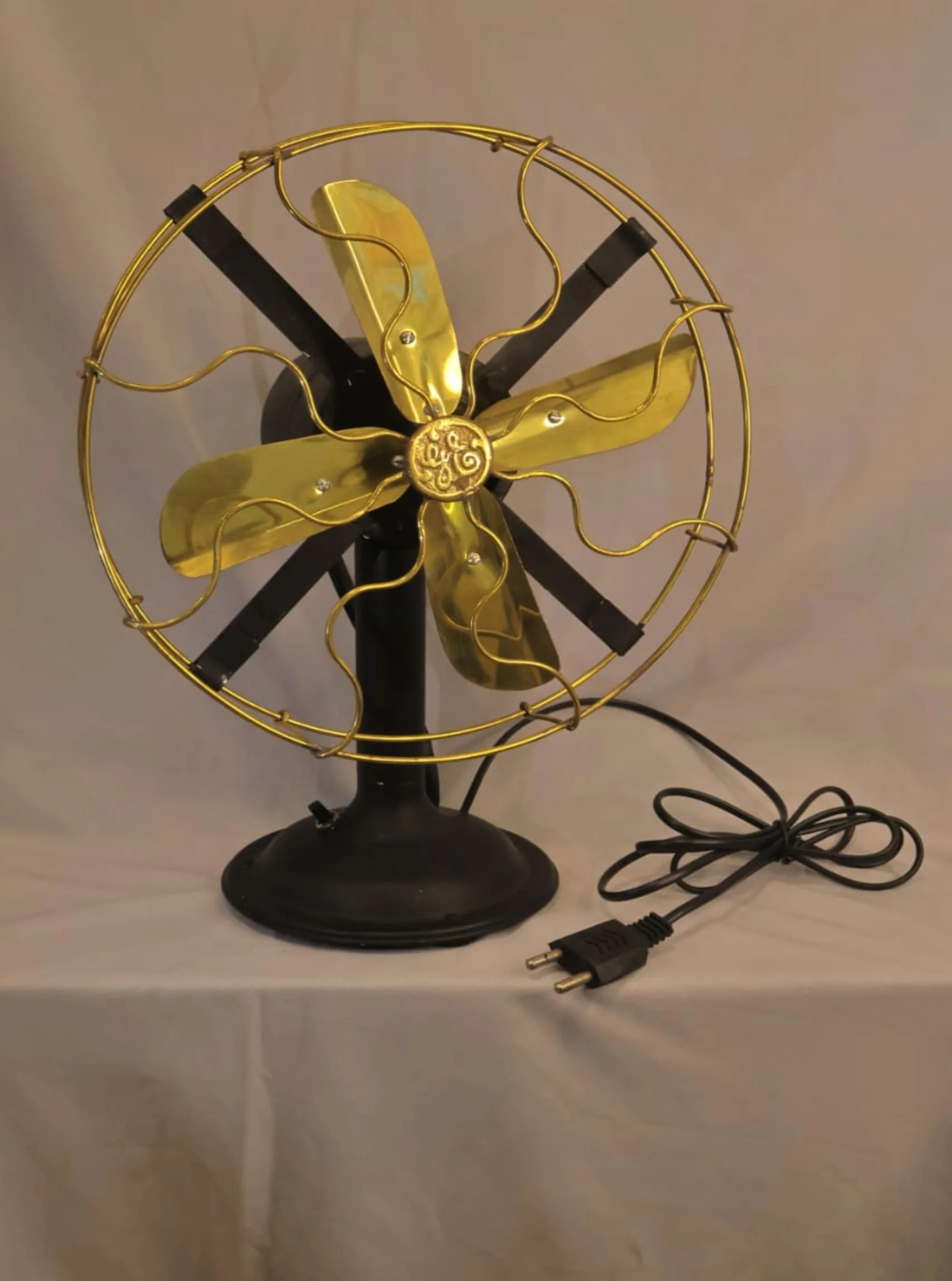 A striking example of small-appliance craftsmanship, this vintage brass tabletop fan blends decorative metalwork with compact functionality. Four contoured, polished brass blades spin within a distinctive wavy brass cage that culminates in an ornate center medallion — details that read as both decorative and authentic. The fan sits on a matte black pedestal base that provides visual contrast and stability; a visible cord with two-pin plug confirms its original plug-in electric design. Surface patina and minor wear are consistent with age and lend character rather than detract, making the fan ideal for collectors who value original finishes or designers seeking an authentic period prop.Dimensions are compact for desks and shelves, while the ornate brass guard and medallion make it a focal point in small spaces. A well-preserved, visually rich collectible that suits vintage lovers, prop houses, and interior stylists aiming for retro or industrial aesthetics.