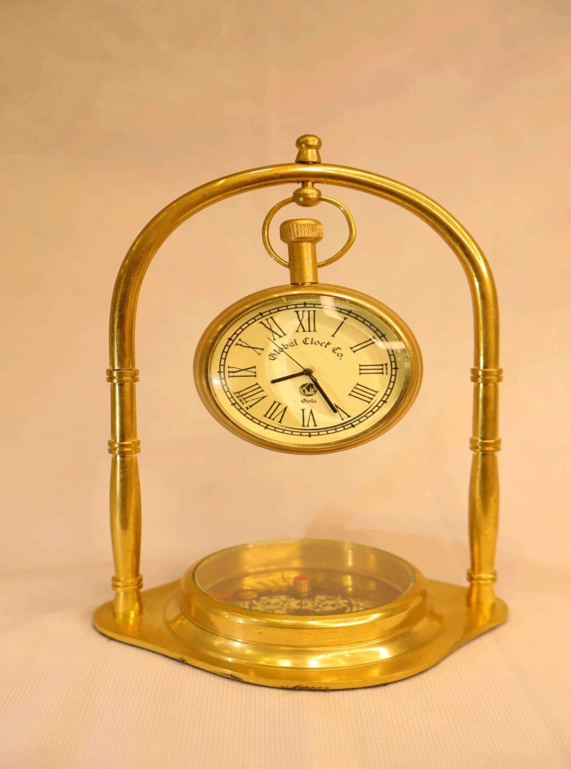 Bring timeless, explorer-style character to any interior with this hanging brass clock featuring a recessed compass base. The piece pairs a bright, easy-to-read dial suspended from a graceful brass arch with a glass-covered compass recessed into the weighted base — creating a compact, display-ready ornament that blends function with storytelling. The warm brass finish and clean white clock face provide high contrast for readability and visual impact, while the compass offers tactile interest and a travel-inspired motif. Perfect on a study desk, bookshelf or mantel, the clock works as an executive gift, collectible accent, or prop for photography and film.