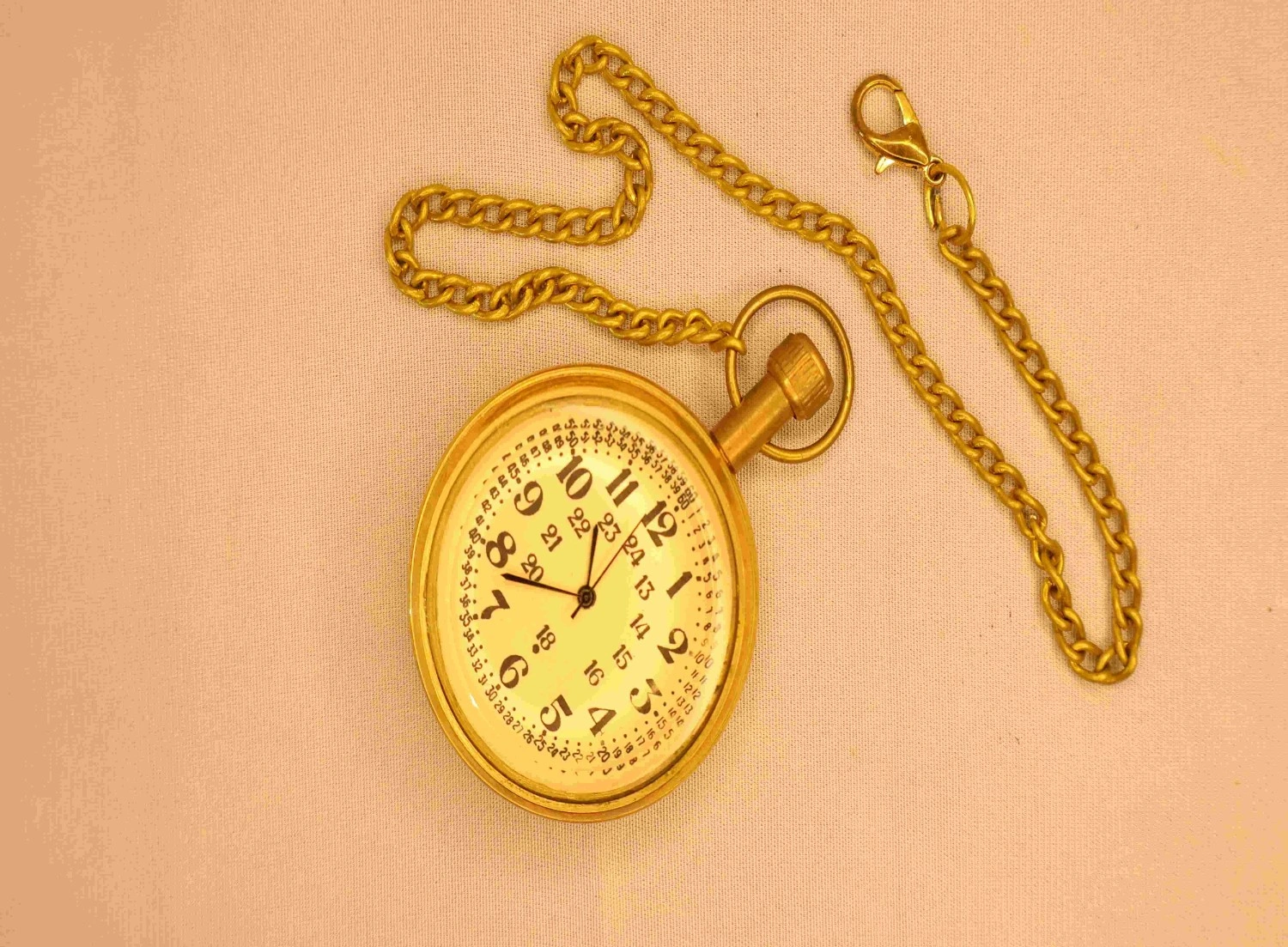 Add a touch of timeless elegance to your ensemble or interior with this Vintage Gold Pocket Watch with Chain. The gold-tone casing houses a clear, highly legible dial with bold Arabic numerals and an inner 24-hour ring — blending classic aesthetics with practical timekeeping. A matching chain allows the watch to be carried traditionally or used as a decorative element on a desk or vanity. The warm metallic finish and compact size make it well-suited to vintage, steampunk or formal looks, while the 24-hour scale appeals to travelers and anyone who prefers military time. Constructed as a decorative and wearable accessory rather than a precision heirloom movement, this pocket watch is ideal as a stylish gift, costume accessory, photo or film prop, or starter piece for collectors.