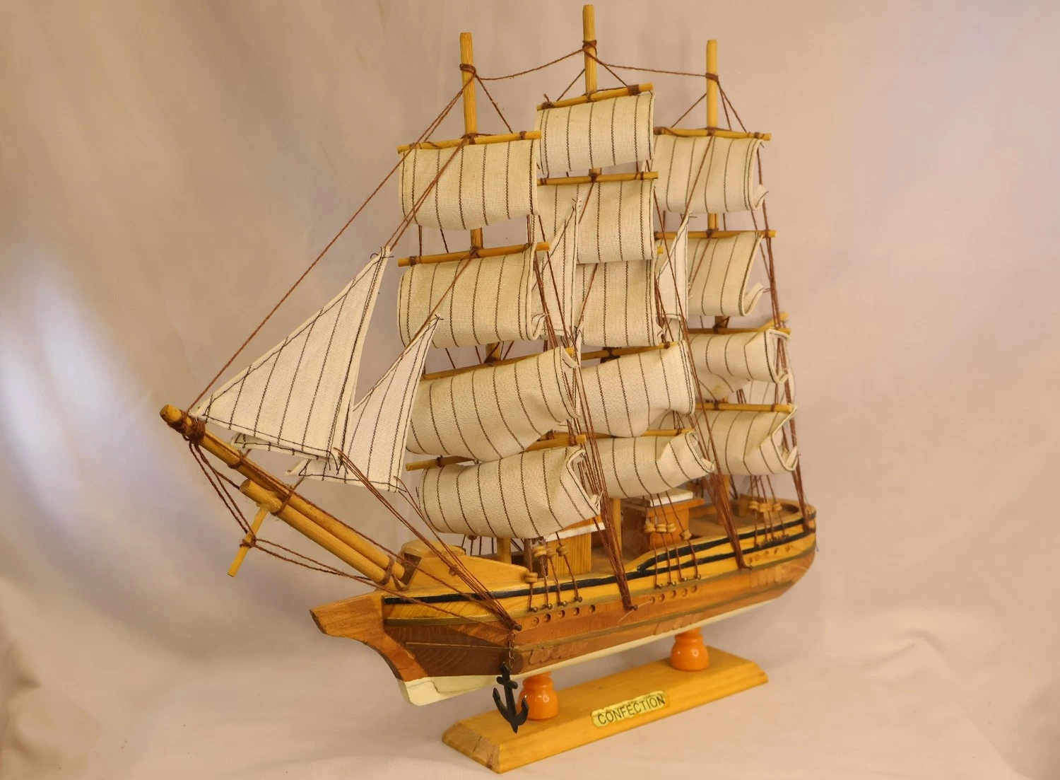 This vintage wooden sailing ship model is a lovingly handcrafted replica that celebrates traditional maritime design. Built from solid wood with carefully stitched cloth sails and authentic-looking rigging, the model captures the silhouette and spirit of classic tall ships. Attention to detail?planked hull lines, deck fittings, masts, and rigging?creates visual depth and invites close inspection, while the mounted wooden base keeps the piece stable for tabletop, mantel, or bookshelf display. The warm wood tones and natural-fiber sails pair beautifully with coastal, nautical, rustic, and vintage interiors. Each model displays subtle artisan variations in grain, finish and rigging tension that testify to its handmade provenance; these small differences make every piece unique. Lightweight enough to move yet substantial in presence, it?s equally suitable for home decoration, office desks, boutique displays, and gallery shelving. Maintenance is simple: dust regularly with a soft cloth and avoid prolonged exposure to direct sunlight or moisture to preserve finishes. Thoughtfully packaged, it makes an impressive gift for maritime enthusiasts, collectors, or anyone seeking a refined conversation piece that evokes the romance of the sea.