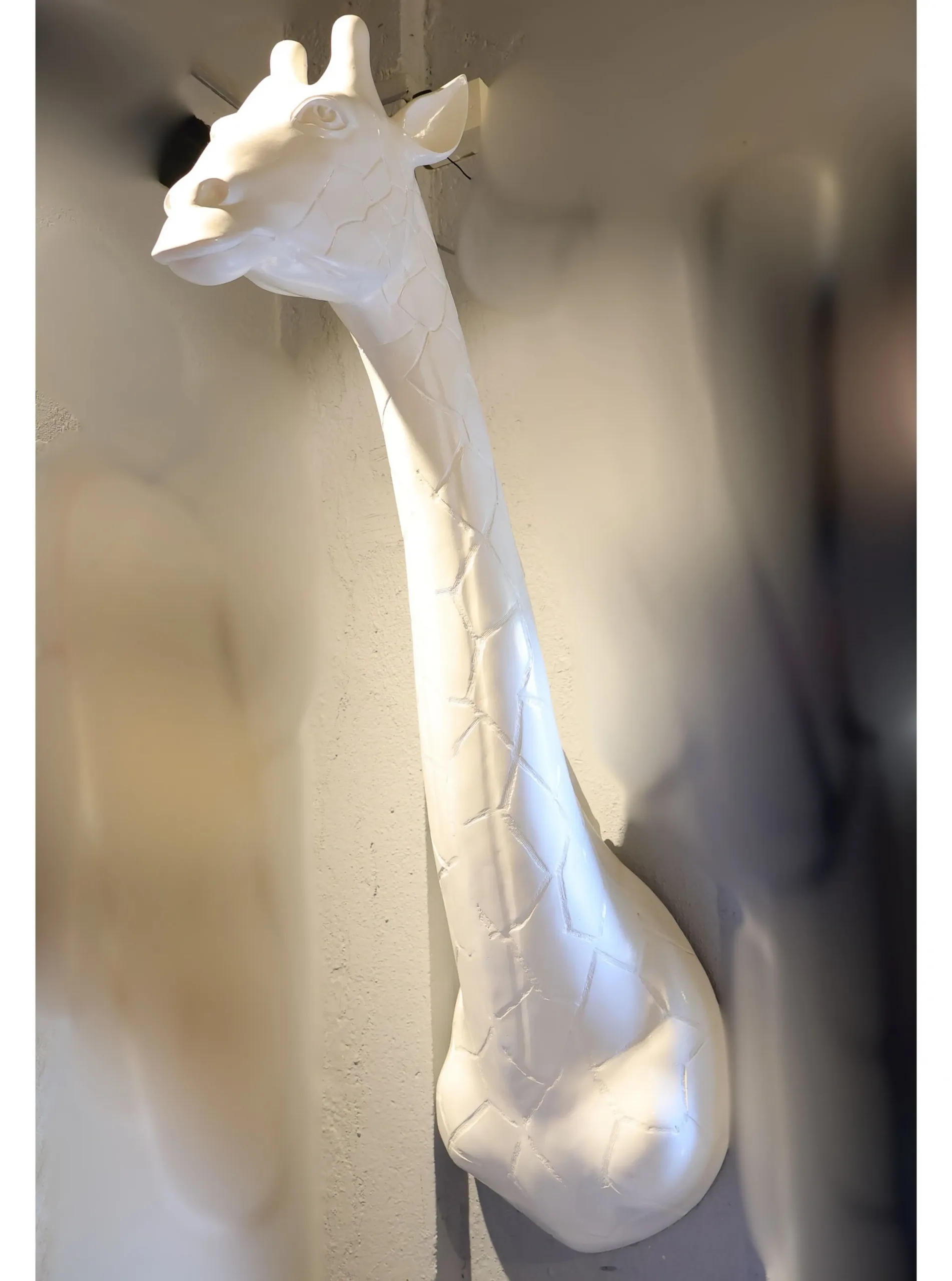 This vertical wall-mounted giraffe sculpture merges modern design with playful character to create a striking decorative focal point. Sculpted with a long elegant neck and a stylized patchwork texture, the piece is finished in a smooth gloss-white coating that emphasizes clean lines and subtle surface details. Because of its elongated silhouette it visually raises the ceiling line and draws the eye upward — a smart choice for narrow hallways, above consoles, or as the centerpiece of a gallery wall. The sculpture is lightweight and designed for easy mounting with a recessed hanging bracket (hardware included where applicable). Its neutral white finish makes it versatile: contrast it against dark paint for high drama or place it on soft pastels in a nursery for whimsical charm. Ideal for contemporary, Scandinavian, and eclectic interiors, it also performs well in boutique hotels, cafés, and office reception areas seeking a memorable accent.