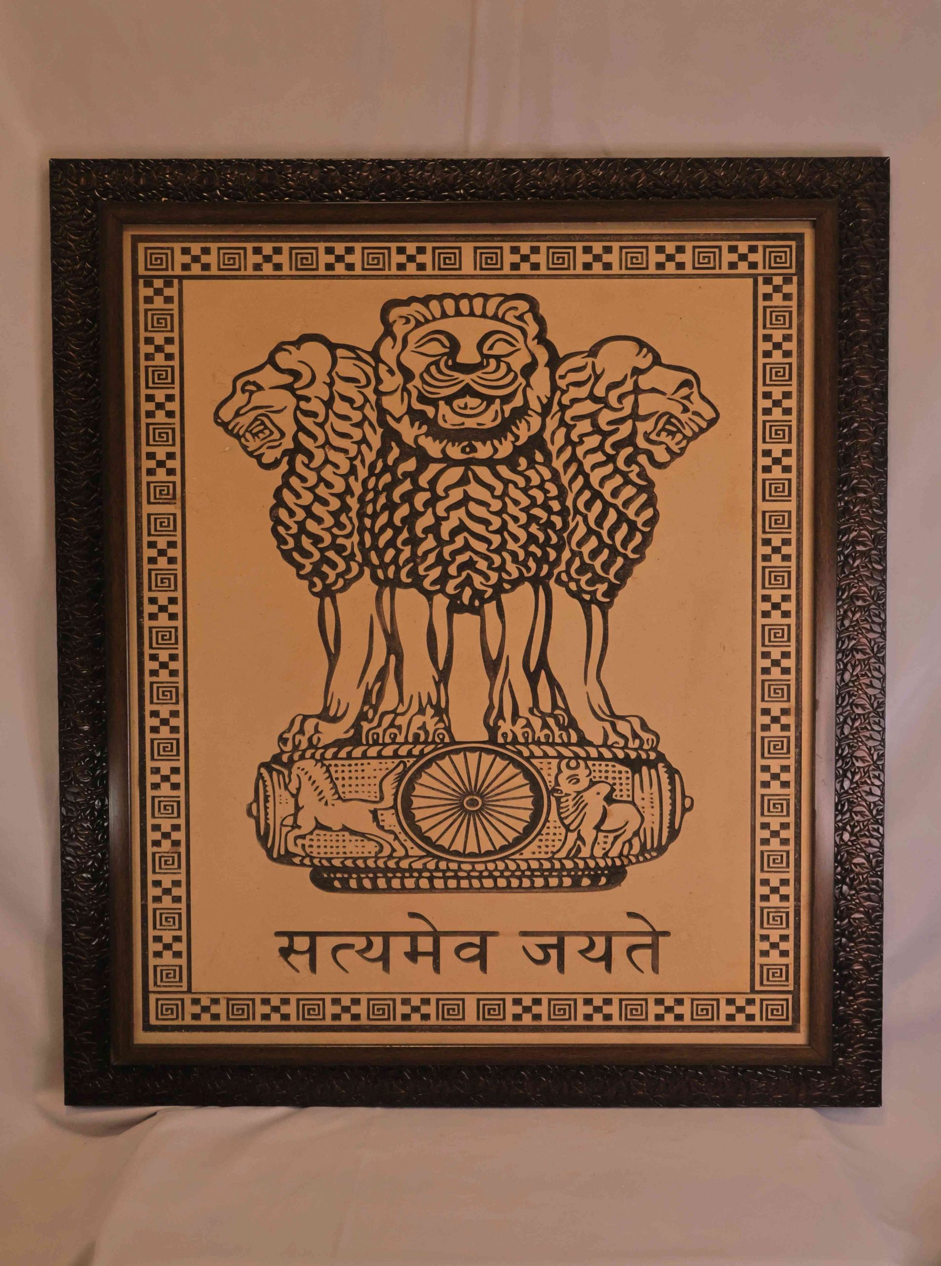 This museum-grade piece is a wood-engraved reproduction of the Ashoka Stambh with the motto Satyamev Jayate in Devanagari, rendered in bold high-contrast lines on a warm tan panel. Mounted in an ornate carved dark-wood frame, it is produced for long-term institutional display and patriotic gifting. The artwork suits government offices, courtrooms, schools and libraries where symbolic gravitas and archival durability are required.